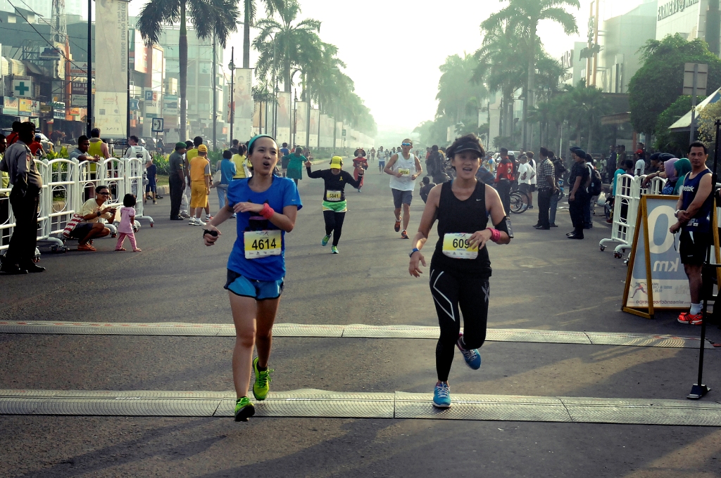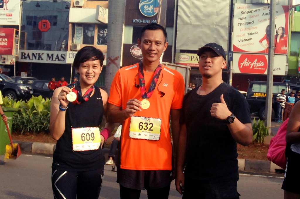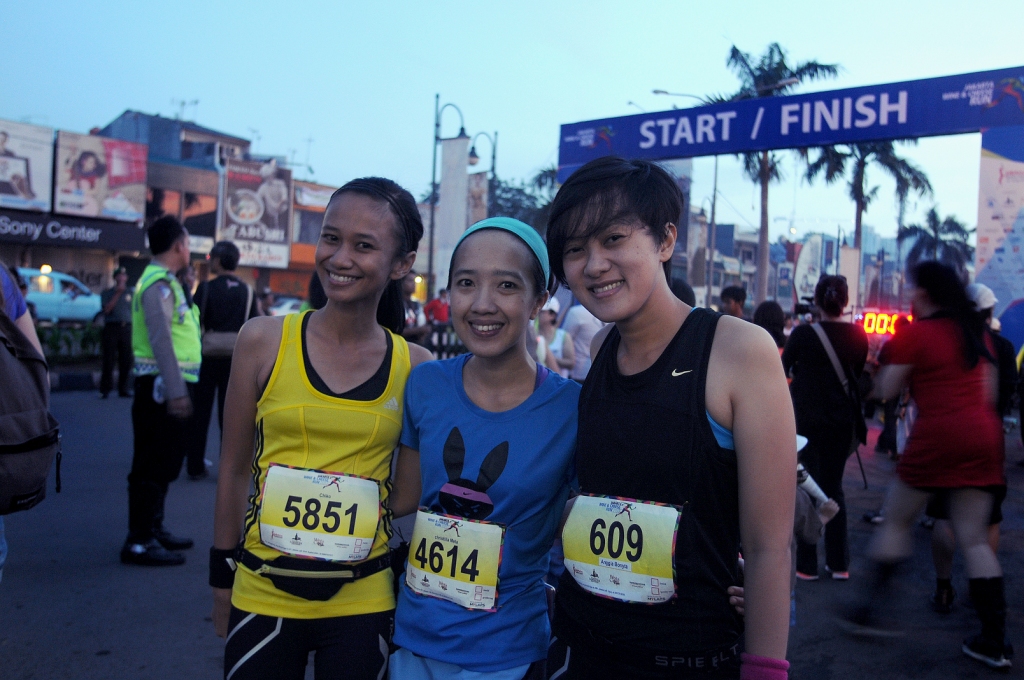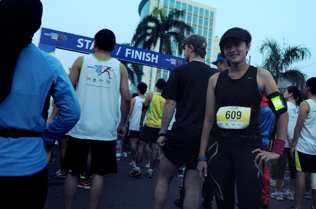 Nyampe di venue, yang dicari pertama kali adalah toilet! Beres dari toilet trus nyamperin Nyanya yang udah siap di starting line. Foto-foto bentar dan pas jam 6, lari pun dimulai! Yang bikin happy, cuaca Jakarta lagi bersahabat, mendung-mendung gimana gitu, enak banget buat lari. Saya tadinya ngebayangin mataharinya bakal terik dan udaranya sesek, pengap, dll, tapi semua itu ga kejadian, yang ada saya beneran nikmatin semuanya. Bisa liat tempat makan di kiri kanan jalan, liatin orang-orang pake kostum, liatin Agus Yudhoyono yang larinya kenceng banget hehe