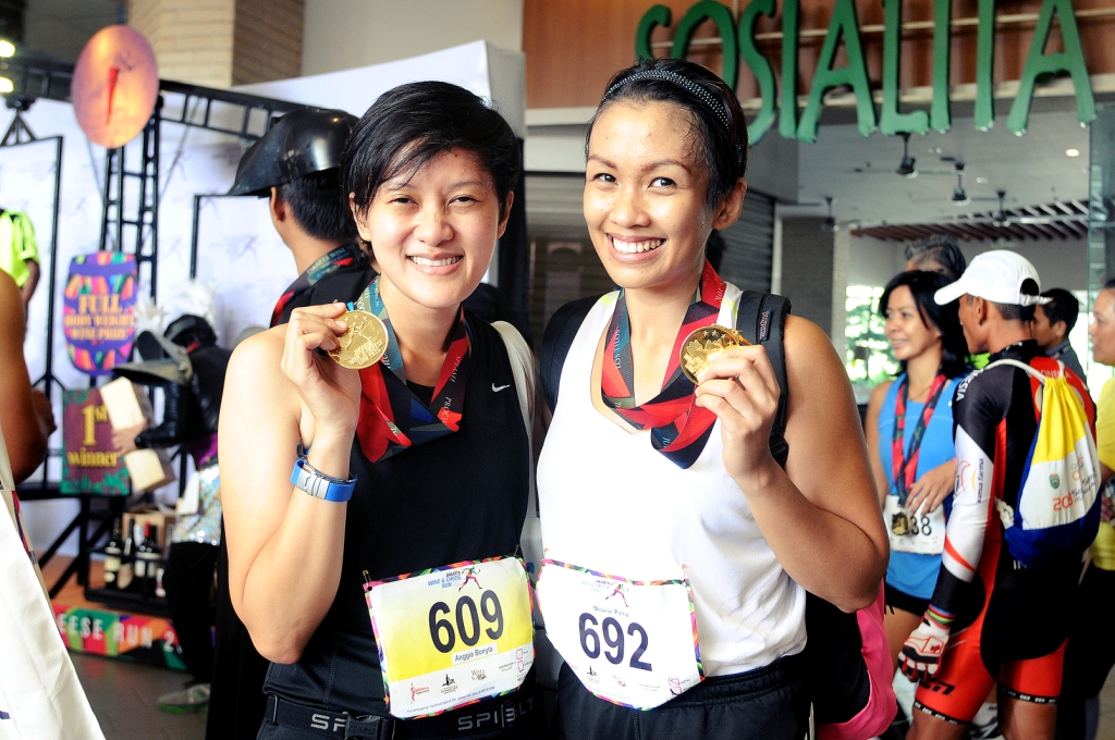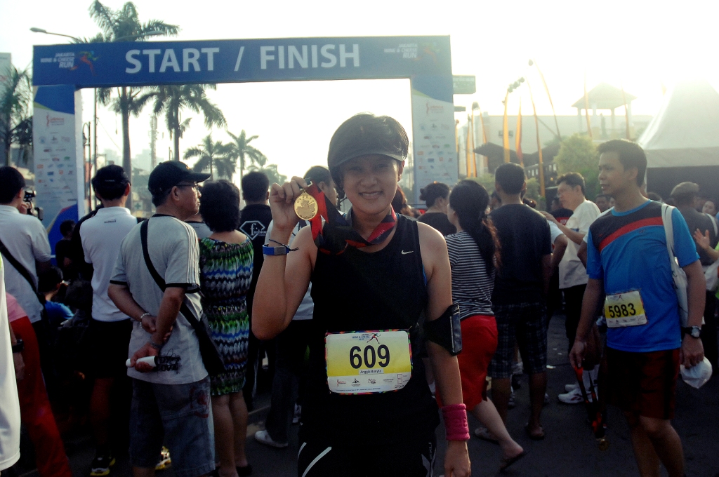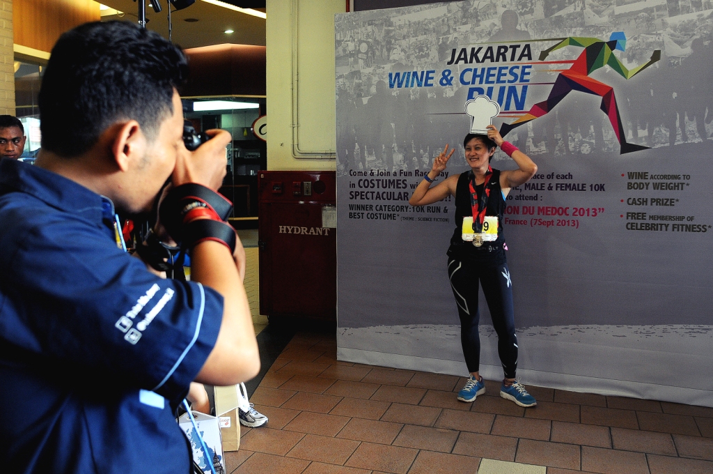 Pacer saya kali ini adalah Nyanya yang kondisinya lagi ga fit. Tapi hebat lho, walopun idungnya lagi mampet, kepala berat tapi tetep bisa nyelesein 10 K, salut! Hal yang bikin hepi lainnya selain ada pacer, yaitu banyaknya official photographer yang siap memotret kita yang tersebar di titik-titik tertentu. Ya dasar banci kamera sih ya, jadinya seneng aja begitu ada kamera yang siap motret kita di starting line, pas race berlangsung dan di finish line. Nanti fotonya bisa kita liat di websitenya Jakarta Wine and Cheese.