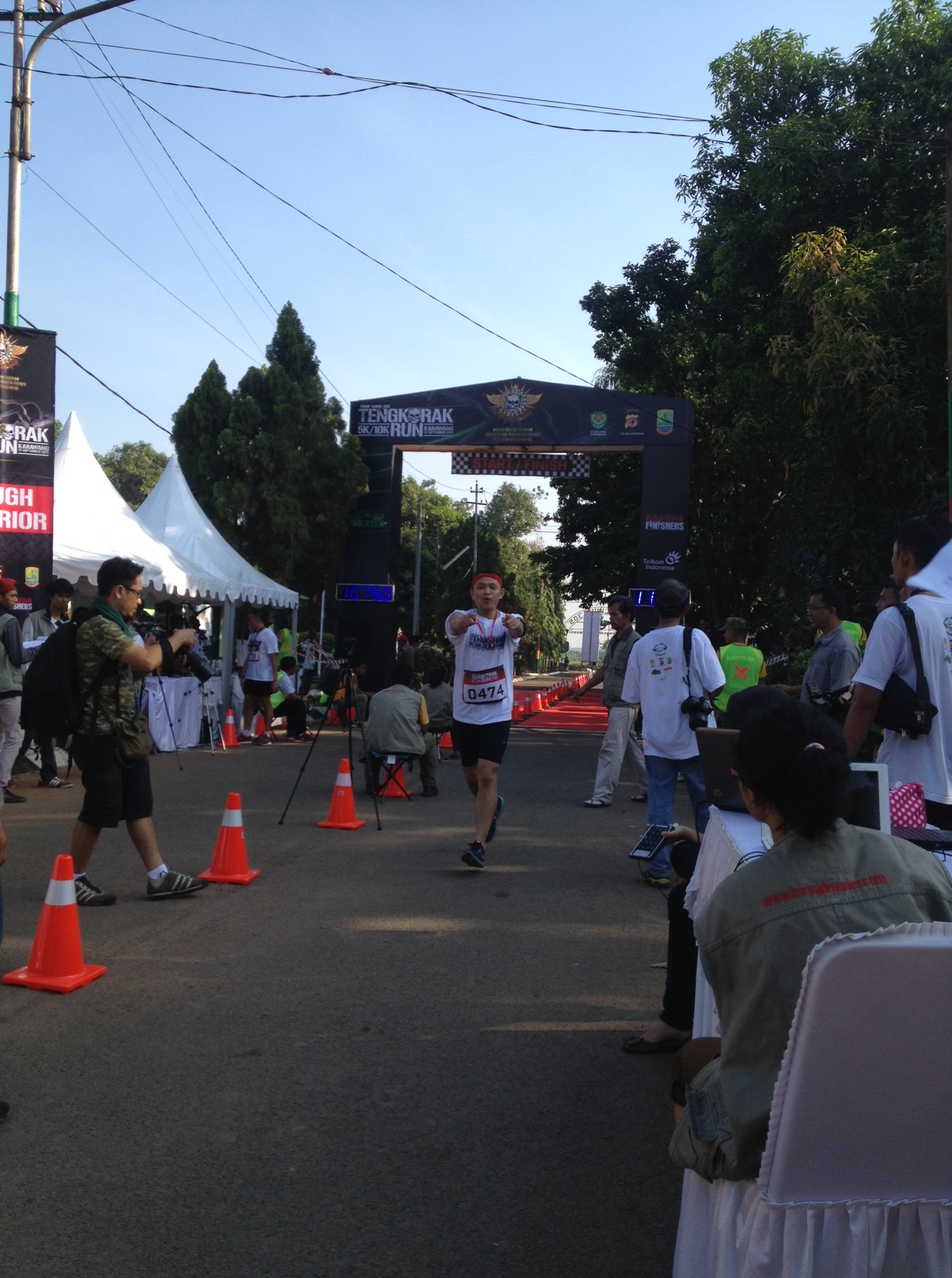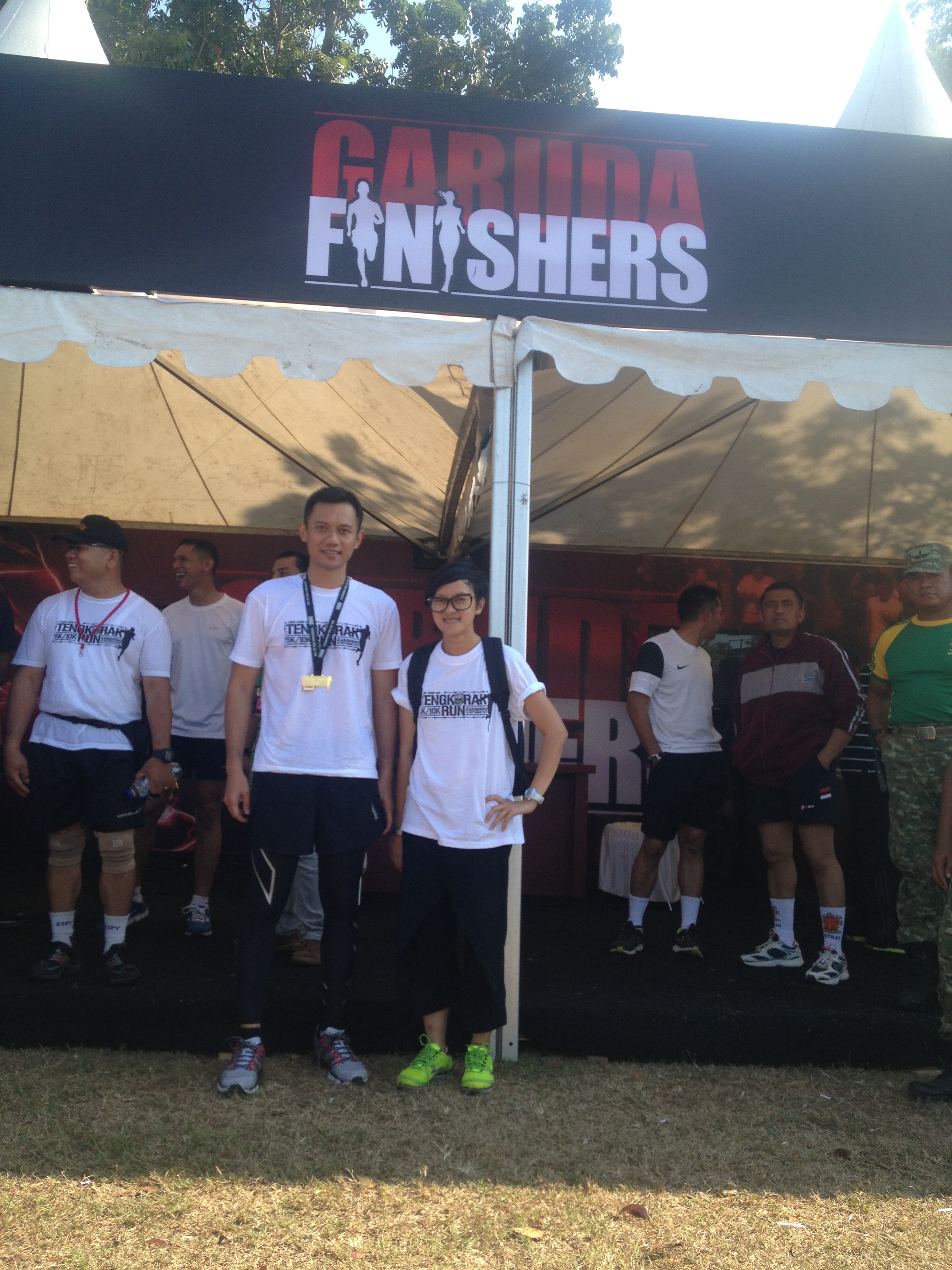 Sambil nungguin Booi yang belum nyampe karena dia ikutan  yang 10K, saya ikutan ngasih semangat begitu kompi yang ikut dalam tough warrior satu persatu masuk finish line. Melihat ekspresi  orang-orang di finish line ternyata menyenangkan banget!  Oya, saya juga sempet liat  seorang bapak tua yang badannya sudah sedikit bungkuk  berhasil sampai di finish line dengan semangat! Hebat banget! Persis quotesnya Garuda Finishers: “It doesn’t matter how fast or slow you are, just run and finish what you have started!”