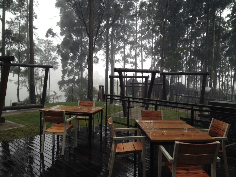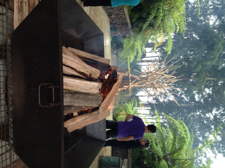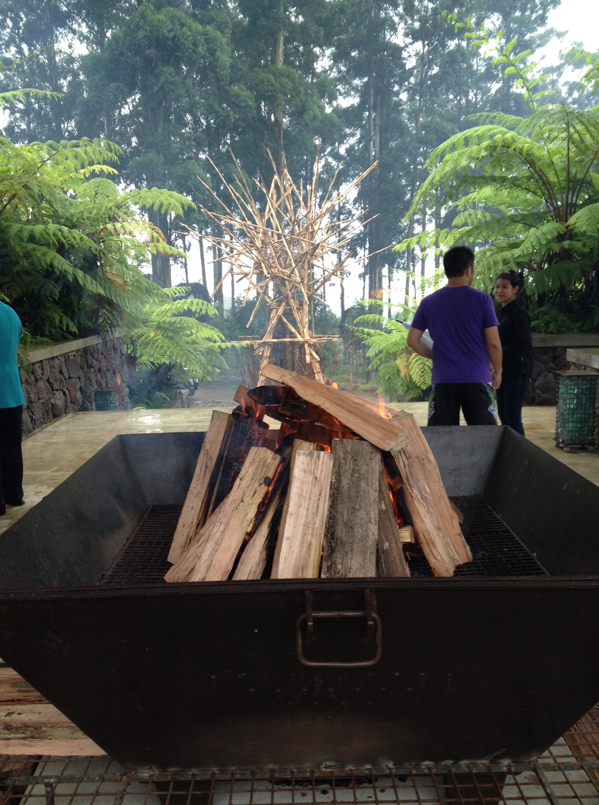 Karena niatnya memang mau makan siang, jadi kita langsung pergi ke kafe Burangrang. Kita bisa pilih mau makan didalam ruangan atau diluar ruangan. Berhubung cuaca kemarin lagi dingin banget (19 derajat dan berkabut),  jadi kita memutuskan untuk memilih tempat didalam ruangan. Oya, sebelum masuk ke restoran, ada api unggun yang ditaruh di tengah-tengah untuk  menghangatkan diri..