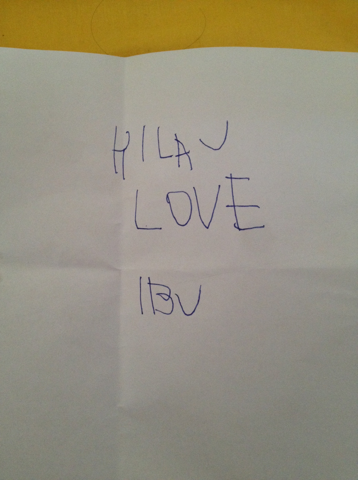 Dibalik keluhan ga bisa fokus kerja di rumah karena setiap dua detik sekali anaknya minta perhatian, ditambah suka ada drama-drama dengan derai air matanya, tapi saya sungguh-sungguh menikmatinya, dan bahkan lebih dari itu. Di ulangtaun ke 4-nya tanggal 17 kemarin, setelah saya ngucapin selamat, Kilau menjawab : “Thank you, tapi Ibu jangan kerja terus ya” katanya dengan muka sedih hahaha..Besoknya, Kilau menghadiahi saya surat yang isinya “Kilau love Ibu” *kiss Kiyaw*. Saya sangat beruntung dikasih anak baik, pintar, ga rewel, dan selalu menghibur saya dengan segala tingkahnya *termasuk lagi seneng ngomong “I don’t like that” sambil pasang muka manyun trus lari ke pojok kamar* hahaha but I feel blessed! 🙂 Semoga Ibu saya juga merasakan hal yang sama saat membesarkan saya 🙂 Saya tahu, 4 tahun jadi Ibu tentu belum ada apa-apanya. Masih banyak setumpuk PR yang mesti dikerjain *pasang kutek dulu cyin..:D*