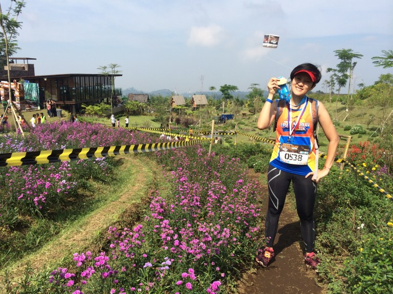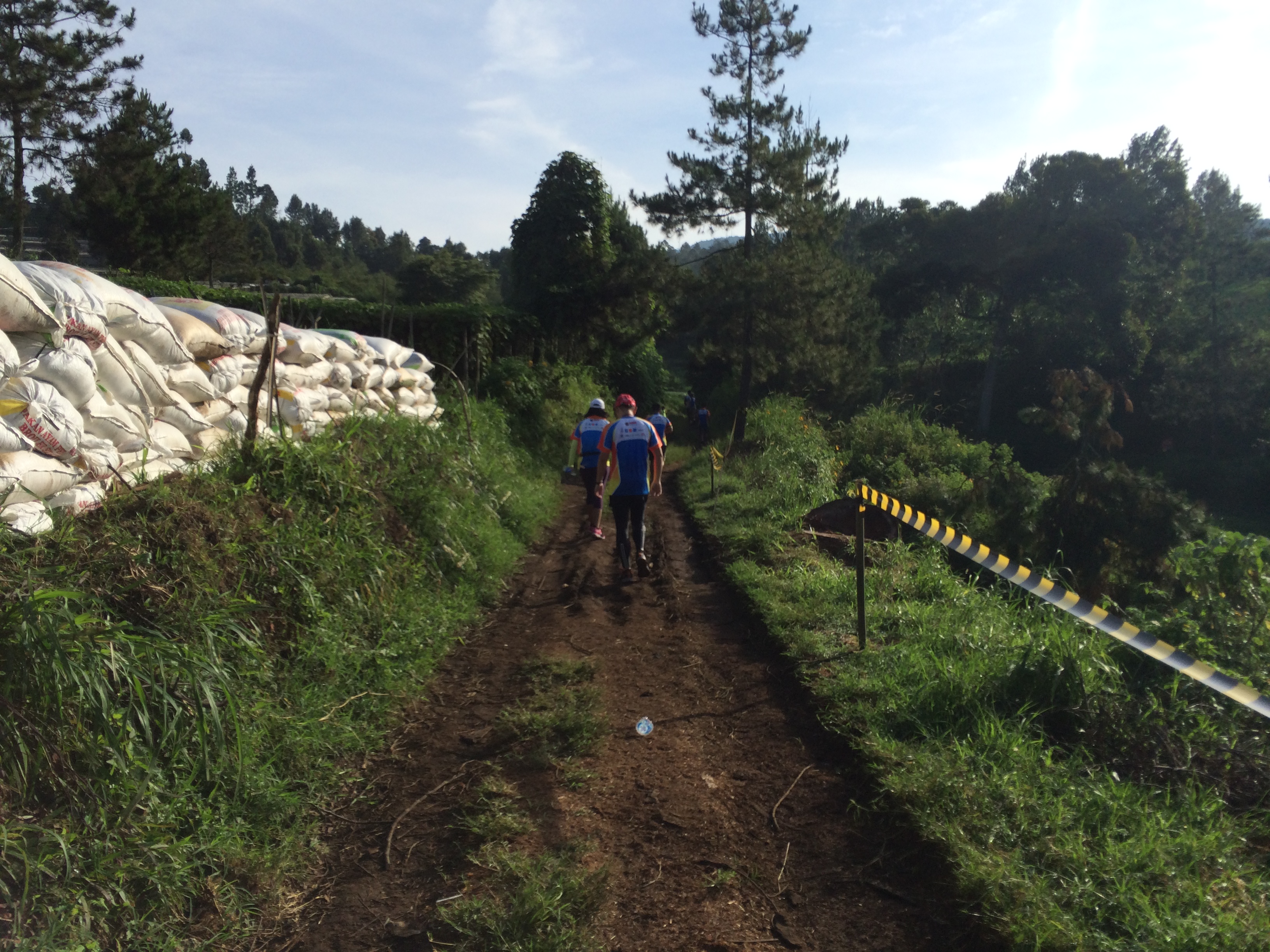 Nyampe sini sih track masih aman, ketemu tanjakan sih tapi ga terlalu parah. Kita masih semangat foto-foto tapi perut udah mulai laper. Untungnya jarak water station satu ke water station berikutnya tuh ga terlalu jauh. Minumannya disedian di gelas dengan dua pilihan, air mineral dan Pocari Sweat dengan jumlah air yang pas. Ga terlalu banyak tapi ga terlalu sedikit juga, cukup untuk ngilangin dahaga. Kalo kebanyakan ntar pasti kalikiben dan kebelet pengen pipis kan? hehe.. Udah gitu, mereka nyediain pisang yang udah dipotong kecil-kecil, sesuai keperluan kita saat itu. Baru deh nemu yang beginian. Cerdas yes?. Dan hebatnya lagi, ga ada tuh peserta yang buang sampah sembarangan. Biasanya kan ya ada aja yang main lempar sampah dimana aja, mungkin karena tau ada petugas kebersihannya. Tapi yang ini beda, sepanjang track itu bersiiiih banget. Ga keliatan sampah seujung kuku pun. Canggih!