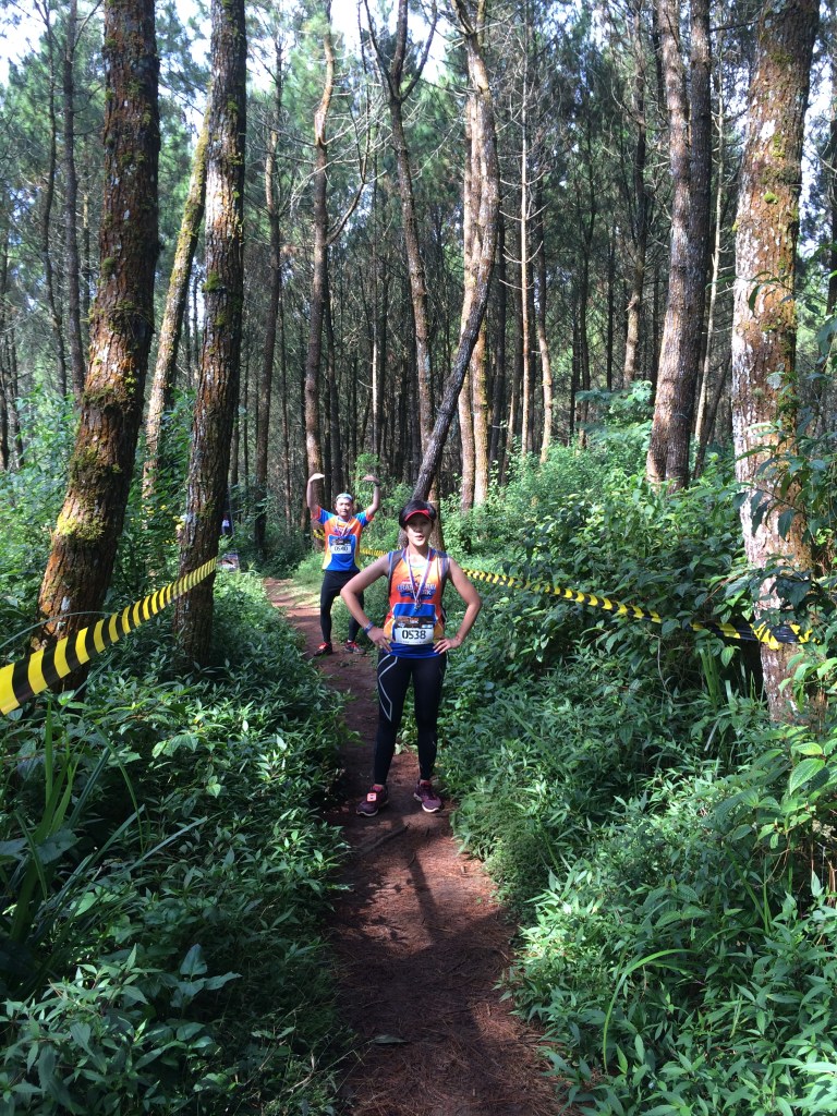 Beres basah-basahan, trus kita masuk ke track hutan pinus. Disini nih kita nemuin tanjakan, tanjakan dan tanjakan. Sepanjang perjalanan juga para marshals menyemangati kita dengan sepenuh hati gitu, ga basa-basi. Sering kan liat marshals yang cuma diem aja, muka cemberut, trus nyemangatinnya juga malah bikin kita ga semangat. Tapi teman-teman marshals kali ini semangat banget, kadang kita becandain juga soalnya mereka friendly, full smile dan sigap banget. Kalo ga salah sih mereka ini adalah temen-temen dari Forum Club Motor Bandung. Two thumbs up buat kalian yang bikin kita jadi semangat lagi walopun nafas udah Senen-Kamis :). Yang lucu, pas lagi di tanjakan menjelang finish, ada mas-mas marshallsnya yang sambil tepuk tangan nyemangatin Gamma yang lagi berenti buat ambil nafas bentar. Sambil tepuk tangan, dengan suaranya yang keras, bilang gini, “Ayo Mbaaa, semangat, biar cepet kuruuuusss” *maksudnya mas?? :p * hahahaha tapi abis itu terbukti kok Gamma jadi semangat sampai di atas, walopun katanya pengen banget ngelempar si Mas pake diapers *ngakak ngejengkang* 😀 Oya, keberadaan temen-temen medik yang selalu stand by dengan jarak yang ga terlalu jauh dari pos satu ke pos berikutnya, bikin kita ga khawatir kalo ada apa-apa.