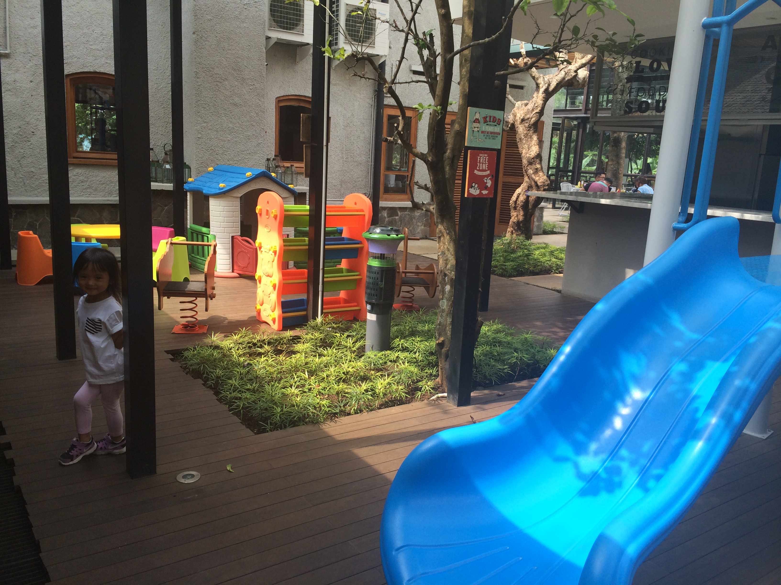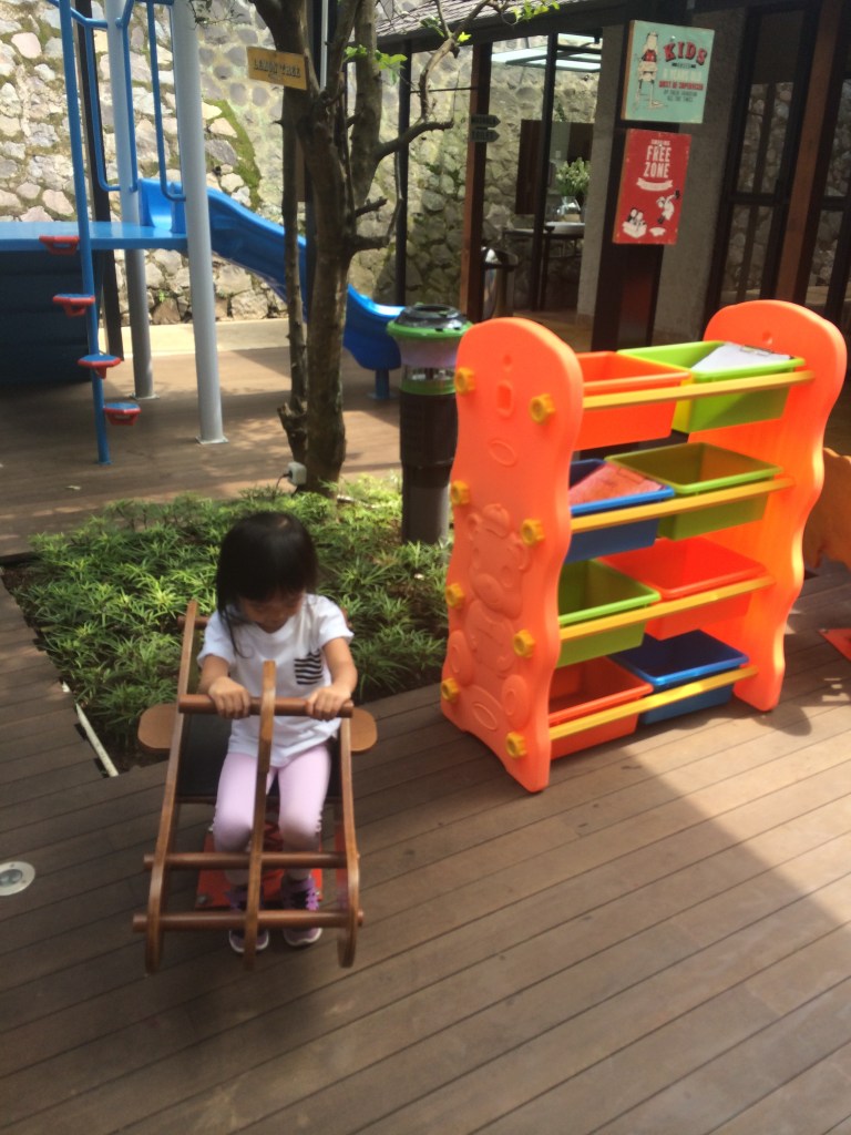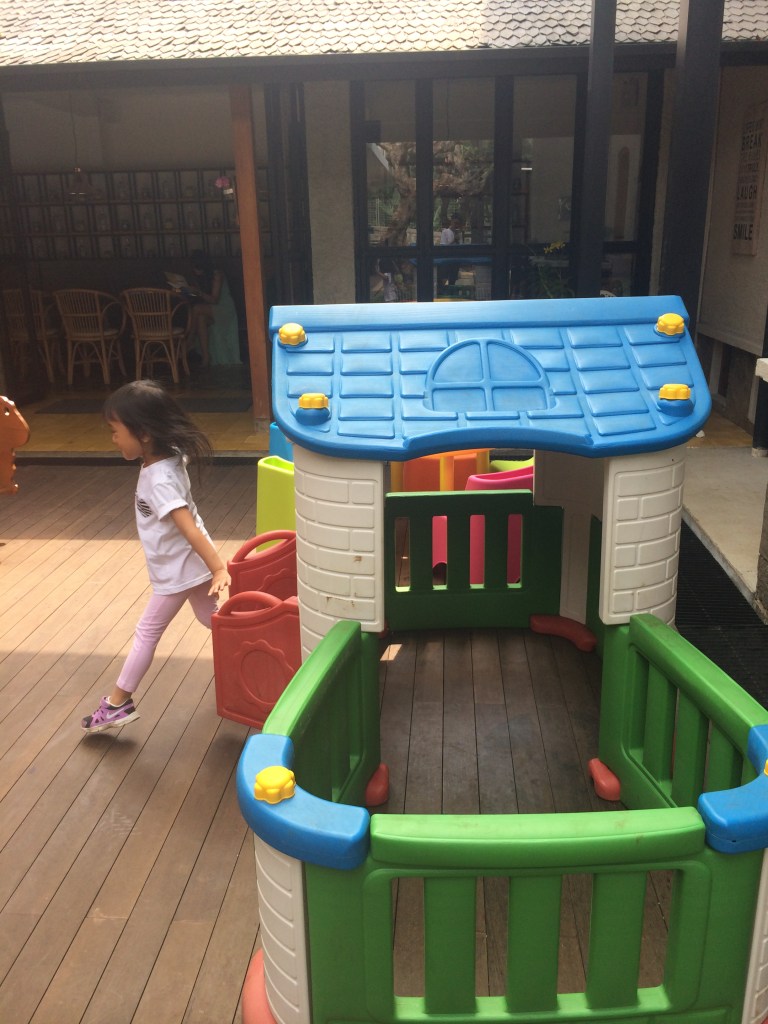 Sambil nunggu makanan dan minuman dateng, saya nemenin Kilau main di playground yang letaknya ada di belakang, persis depan-depanan sama open kitchennya mereka. Ada satu room yang kayaknya selalu rebutan direserved, namanya ruang Aster *kalo ga salah :p Jadi semacam VIP room gitu *kayanya ya…letaknya persis didepan playground. Cocok banget buat ngumpul sama temen-temen  karena anak-anaknya bisa diawur aja suruh main di playground dan ibunya bisa ngawasin tanpa repot harus bolak-balik kesana kemari.