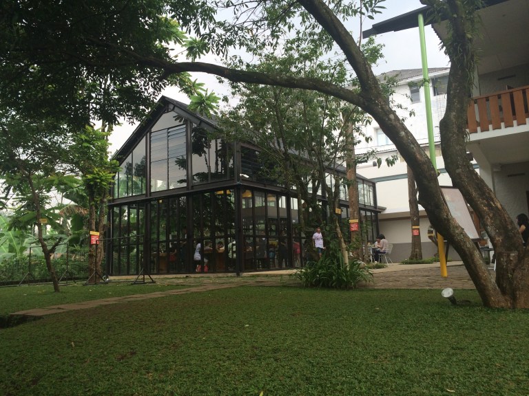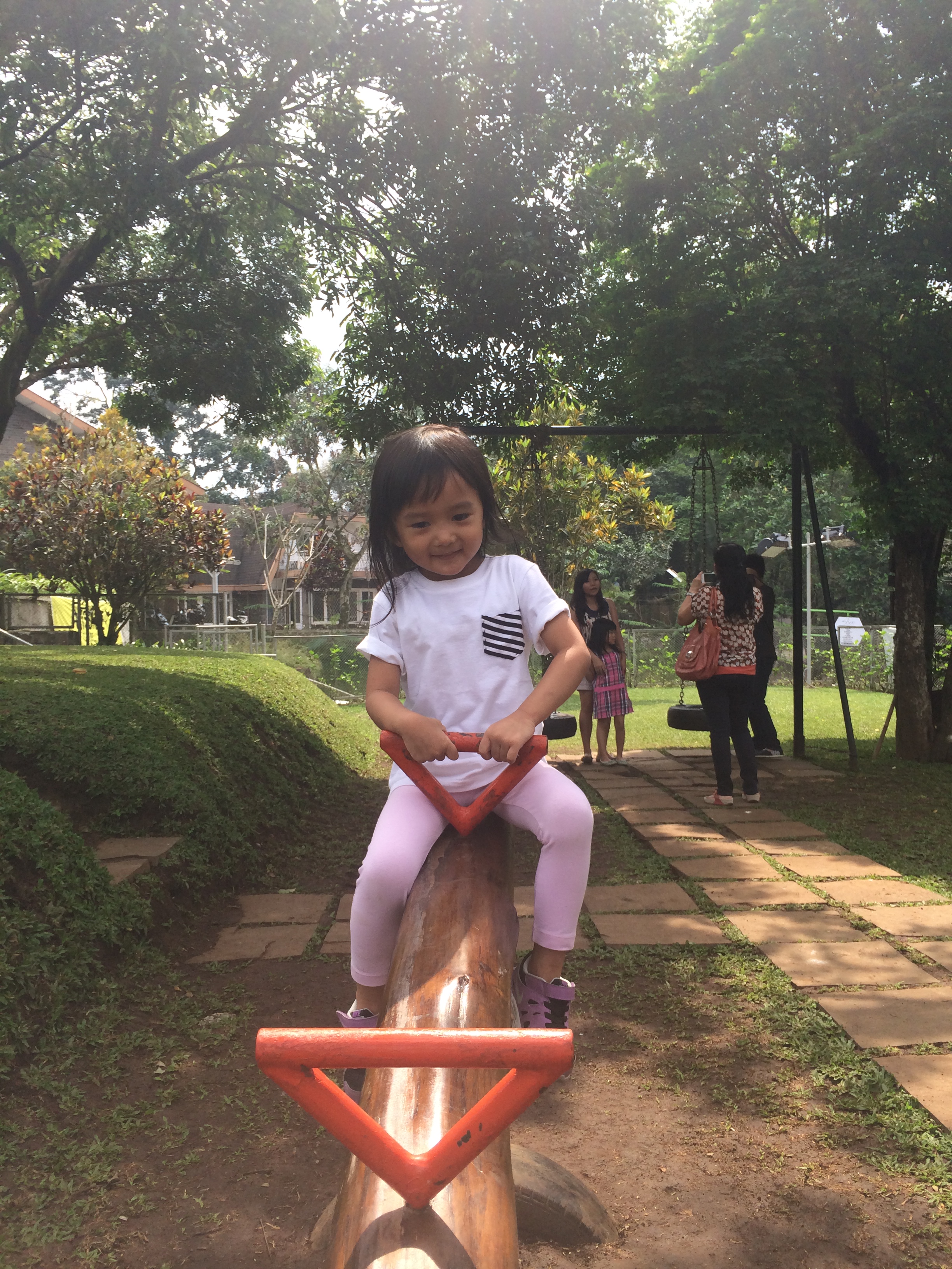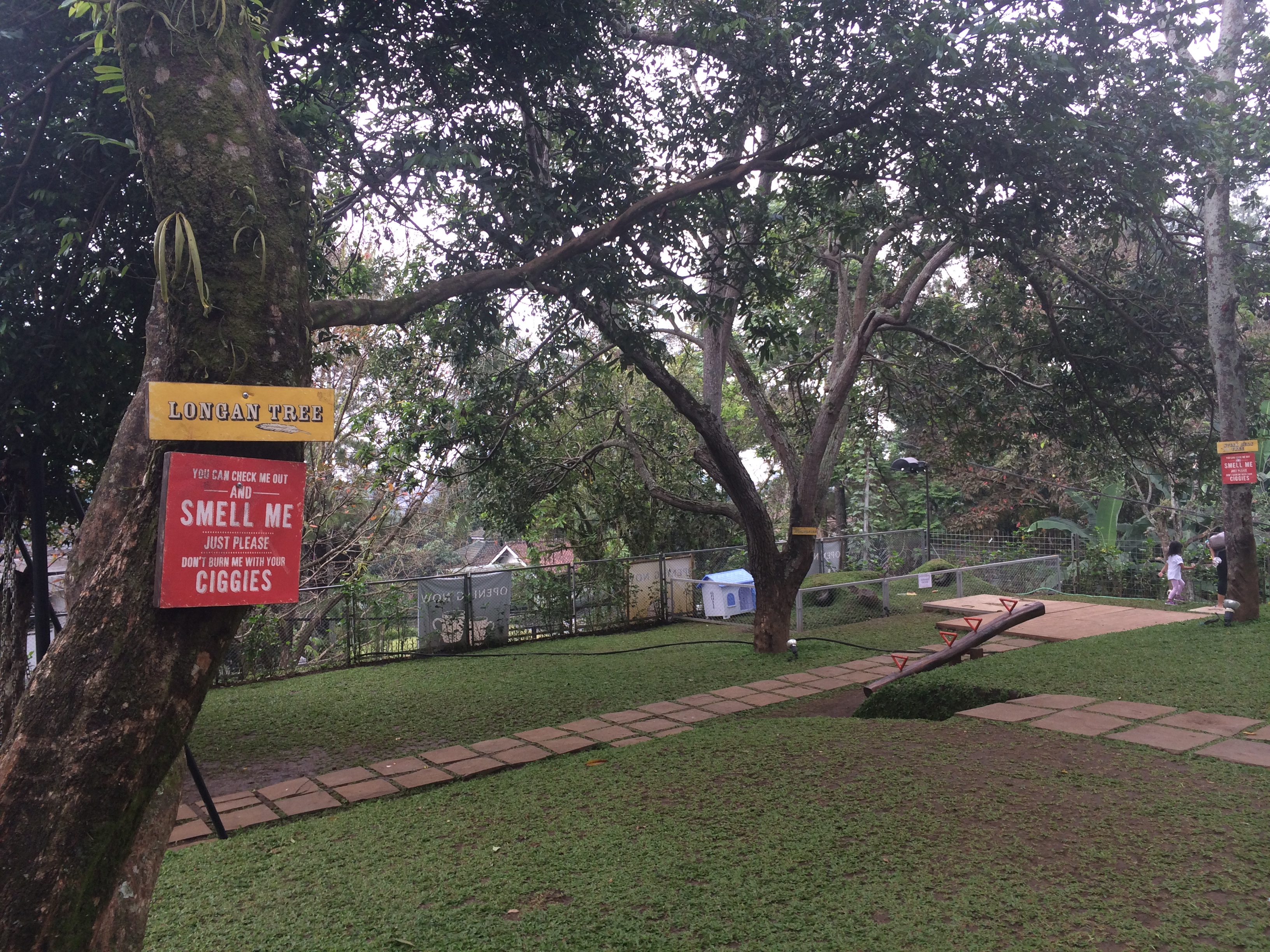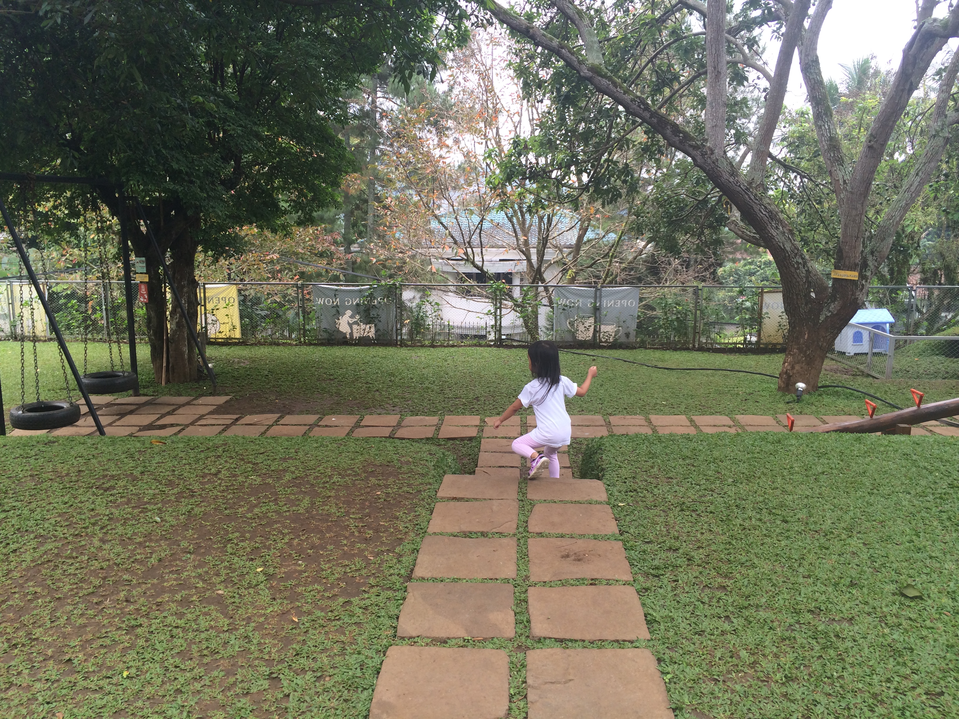 Untuk masuk ke tempatnya, kita harus lewatin tangga dan begitu nyampe diatas langsung excited sendiri liat  halaman yang luas dan pepohonan yang rindang.  Kilau langsung happy banget liat hamparan rerumputan, kandang kelinci, ayunan dan jungkat-jungkit yang ada disini.  Dalem hati ngomong sendiri, “Curiga ga bisa bentar sih  liat beginian mah”, dan ternyata benar…hihi betah banget berlama-lama disini,  karena  banyak detail-detail lucu  di setiap sudutnya yang bisa diexplore dan difoto 🙂