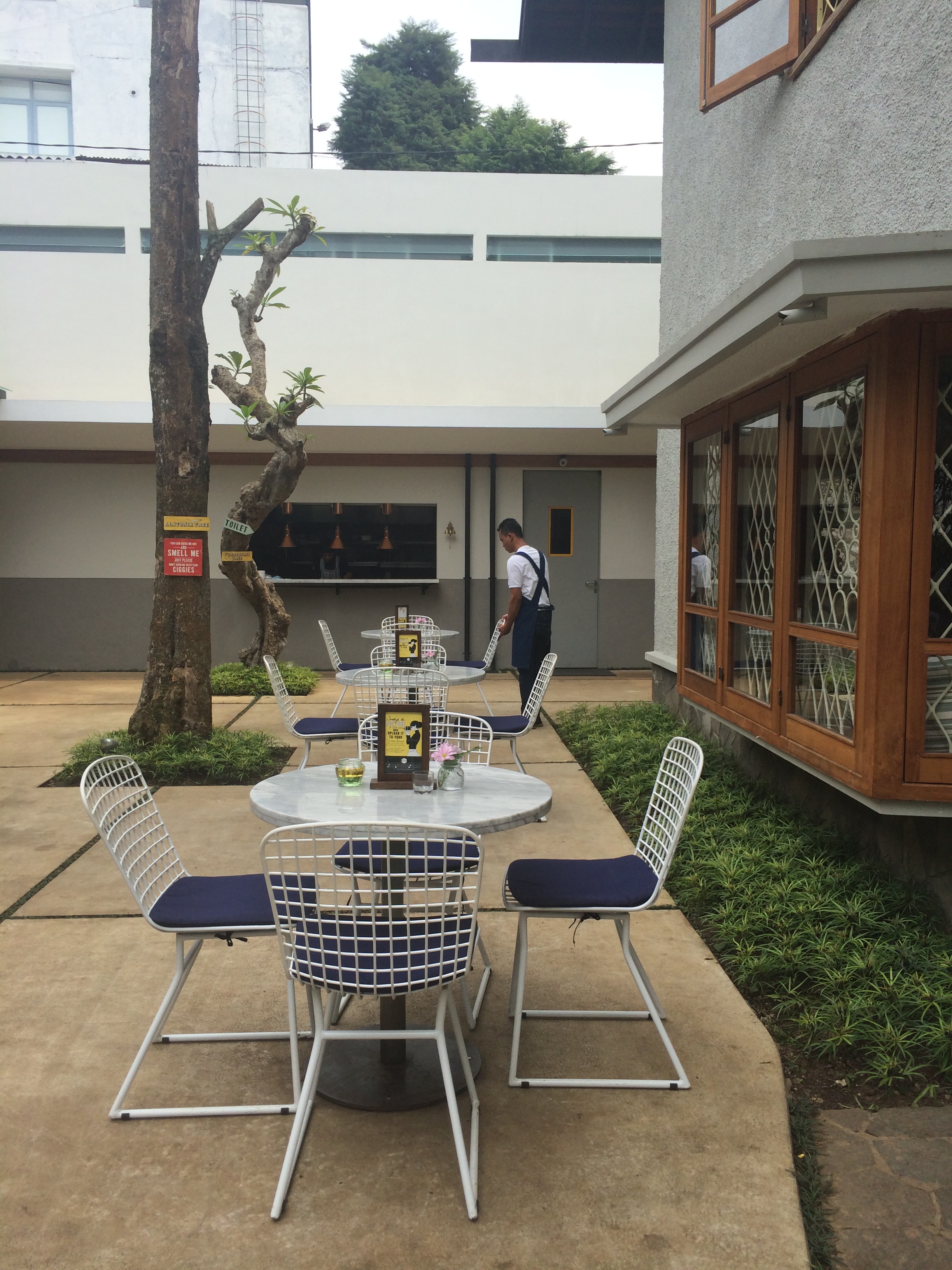 Area makannya juga cukup luas. Ada outdoor & indoor juga. Tadinya kita milih didalam bangunan kaca, tapi ternyata karena datengnya rada siang, jadi agak panas, dan akhirnya kita pindah ke dalem. Suasananya homy banget, kaya dimana gitu..Oh iya, kaya di rumah orang kaya *teuteup orang kaya 😀 Ada tangga keatas juga, kayanya sih boleh juga makan diatas. Ih seruu ya…lain kali mau nyobain ah makan di lantai atas. Pokoknya mau nyobain semua seat yang ada di tempat ini ahahaha..