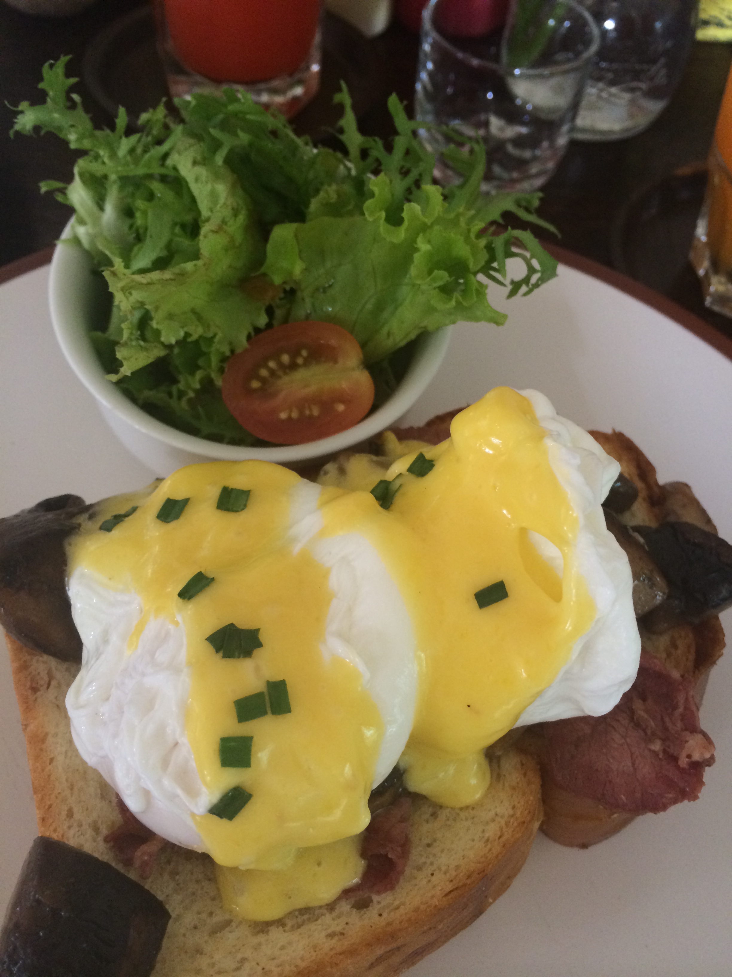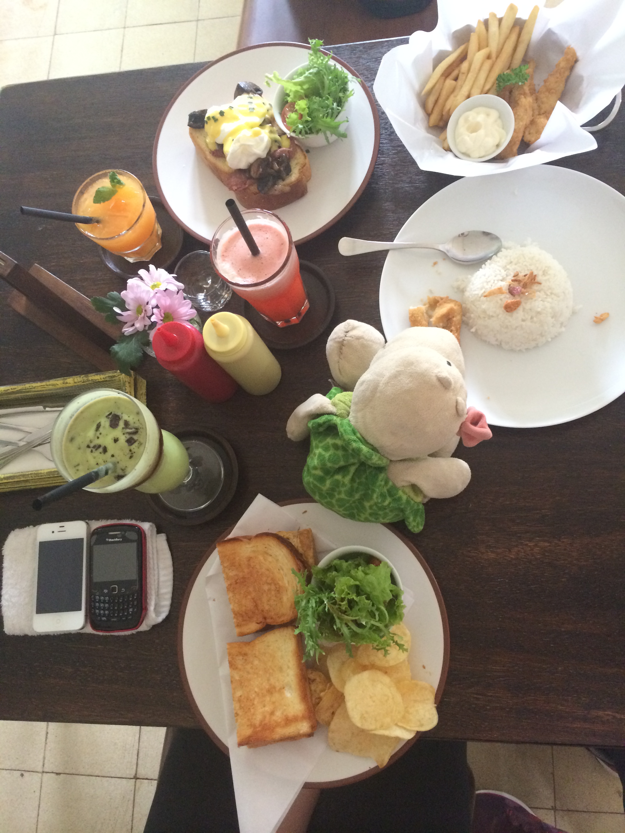 Ternyata ga perlu nunggu lama, makanan udah ready. Saya pesen Egg Benedict dan My way juice, juga  chicken fingers, Yola mesen Corneed Beef Sandwich sama Avocado juice, dan Kilau memesan sendiri menu andalannya yaitu apaa?? ..Ya! Nasi putih! 😀 Soal harga sih  sama aja kok kaya Hummingbird, dan enak-enak semuaaa *happy*. Karena atmosfernya enak banget juga buat ngobrol santei, hampir dua jam disini tapi rasanya baru 5 menit 🙂