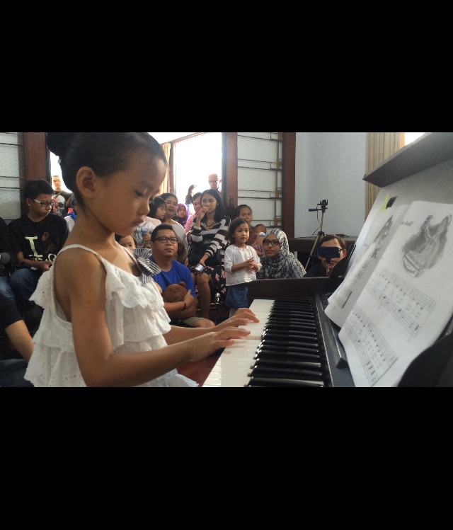 Tadinya saya pikir fase deg-degan udah terlewati pas konser pertamanya Kilau, eh tapi ternyata tidak sodara-sodara 😀 Tetep dong, Ibunya jauh lebih senewen daripada anaknya, padahal ini adalah konser yang kelimanya di Melodia, tapi buat main piano sih, baru kedua kalinya. Kalo waktu itu   main pianonya baru pake satu tangan, nah tahun ini udah mulai pake dua tangan. Makin lama, main pianonya makin susah juga. Banyak istilah baru, banyak tanda baru, belajar pindah posisi, belum lagi notnya tambah dempet-dempet aja. Saya yang emang ga bisa baca not balok, lumayan keteteran ngikutinnya. Ada untungnya juga ngedampingin Kilau tiap les,  Ibunya  jadi ikut belajar gratis hehe.. Kemarin-kemarin saya udah sempet ngerti dikit, tapi begitu notnya pindah posisi, trus mulai bingung lagi hahaha.. (Emang ga keotakan aja sih kayanya :D). Jadi saya beneran takjub tiap liat anak kecil bisa main piano, termasuk liat Kilau juga.