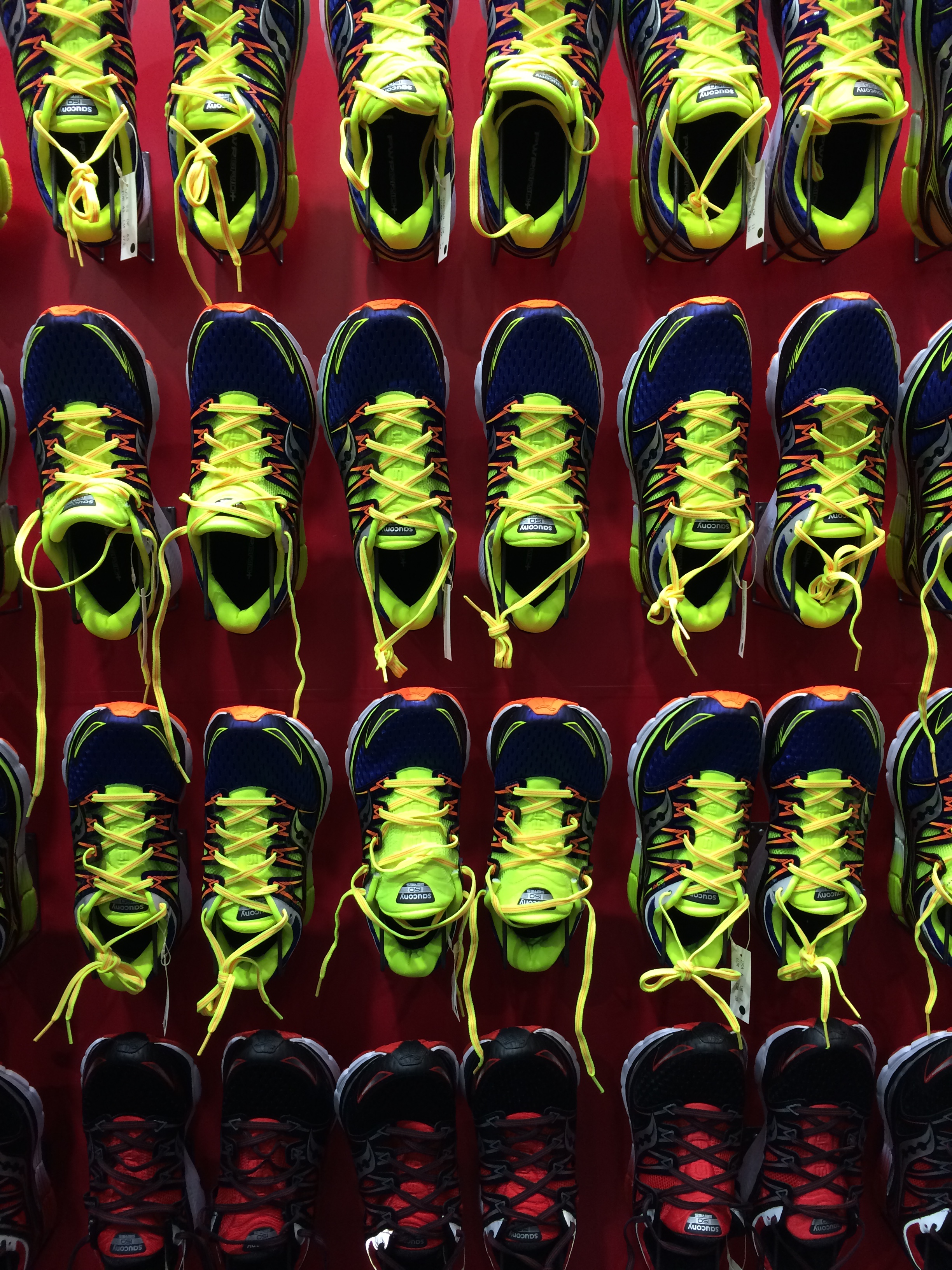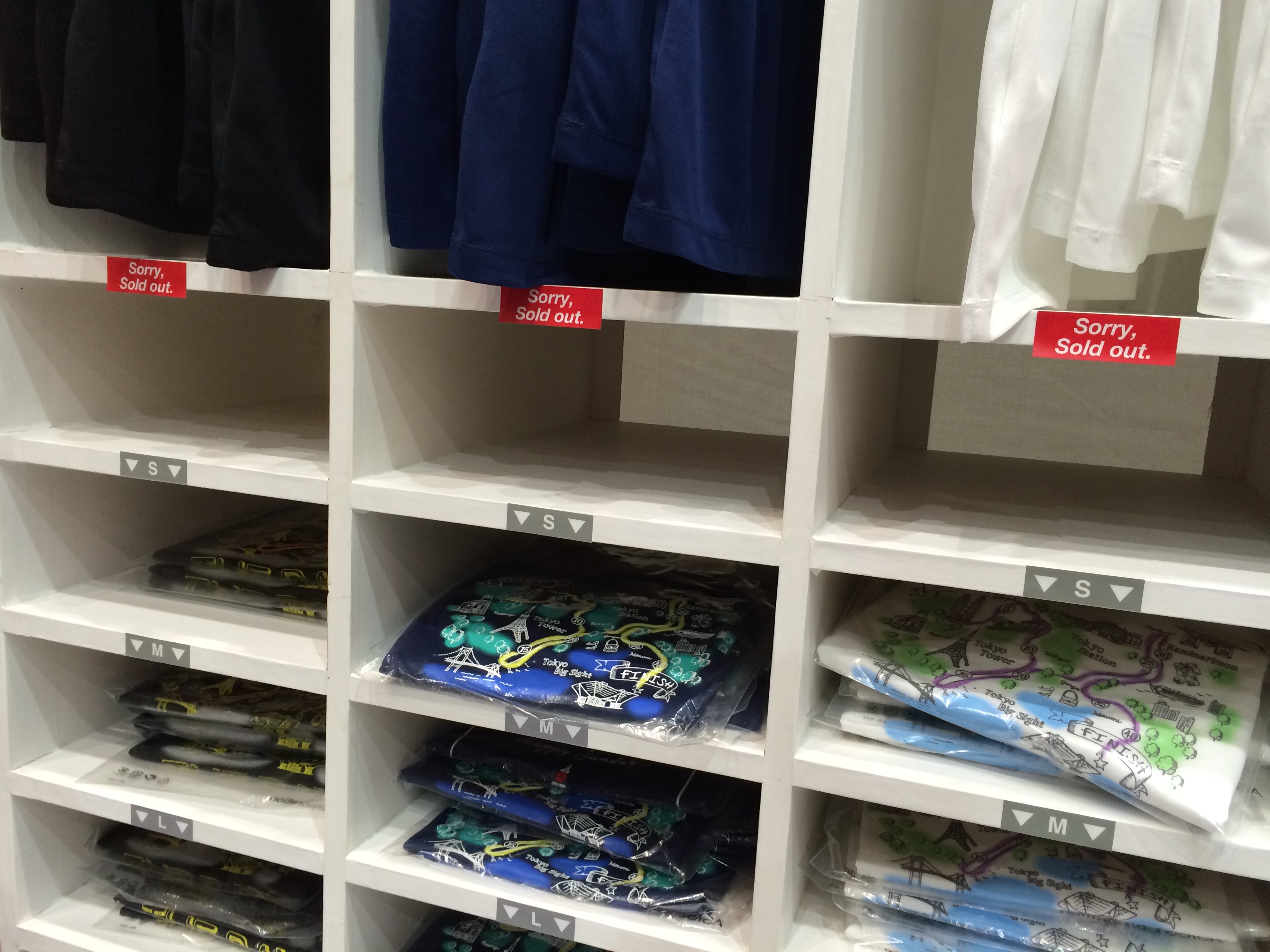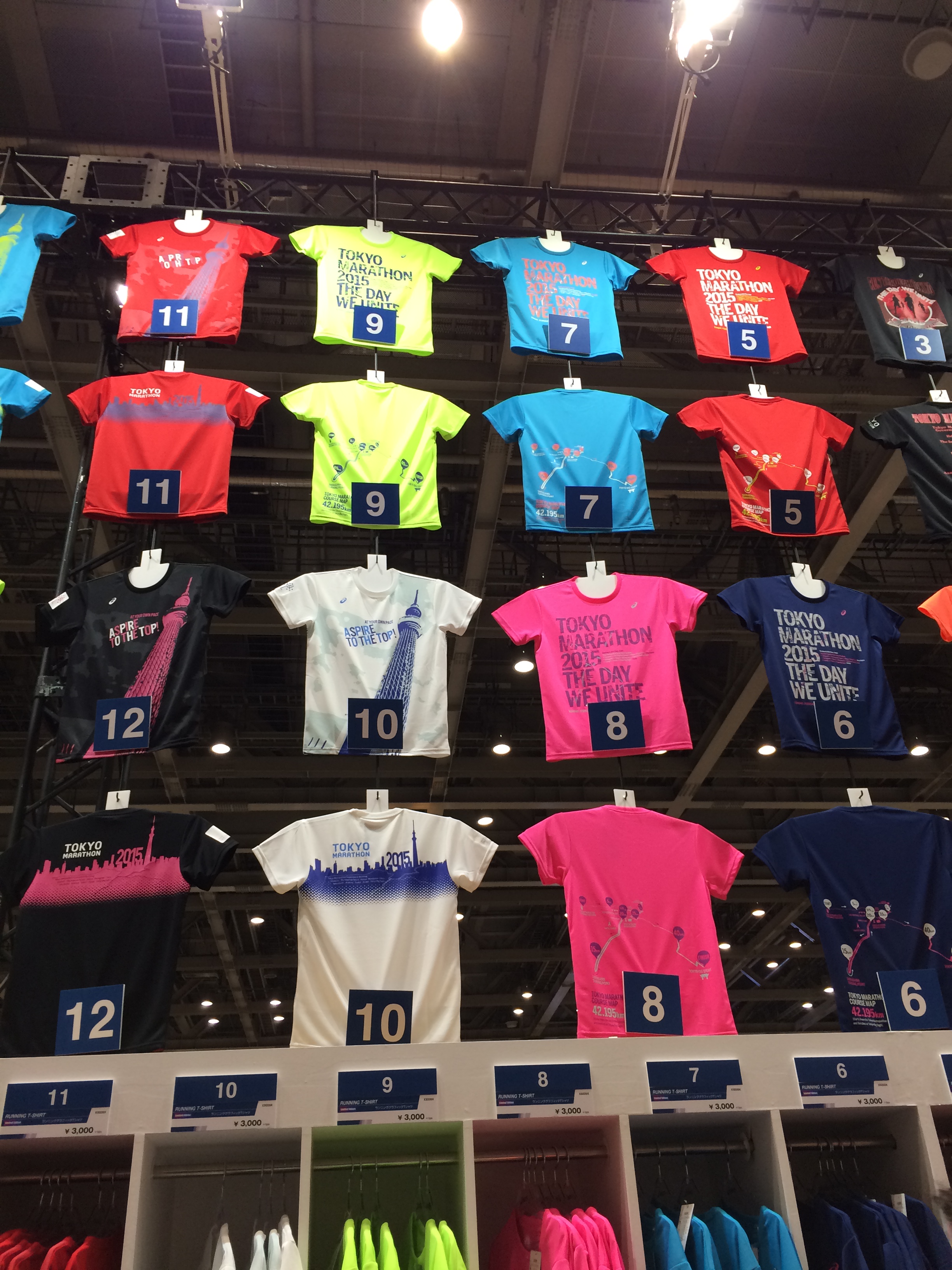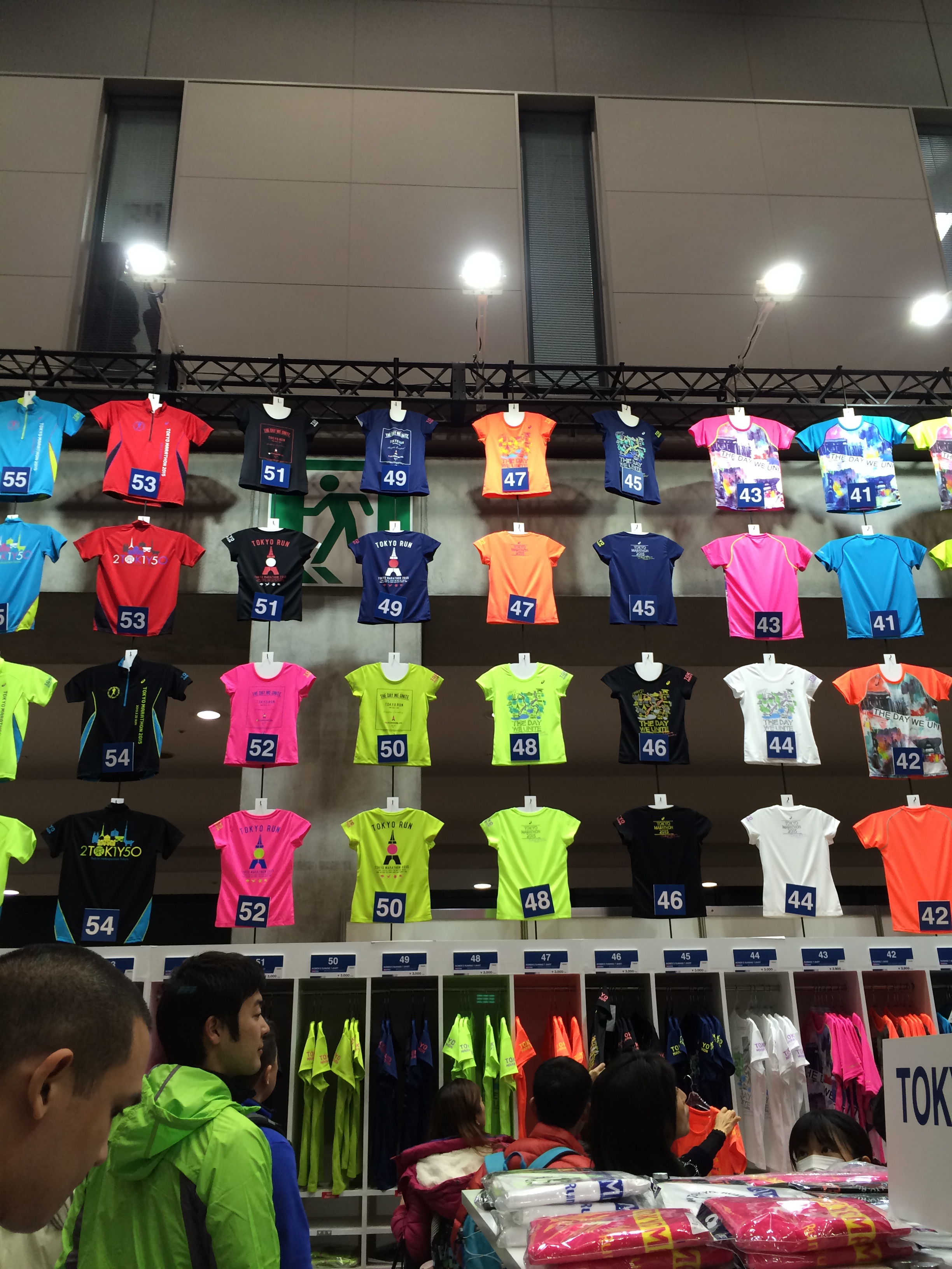Setelah puas merambah area ini, kita pun masuk ke area exponya yang  emang gedeeeeeeeee banget dan dua lantai pula. Semua merk yang belum pernah saya liat ada disitu semua. Jangan tanya apaan ya, ga inget juga hihi… Pokoknya lengkap banget. Dari mulai running gear dengan segala promonya, macam-macam energy gel yang bisa dicoba, berbagai minuman dari isotonic sampe bagi-bagi bir gratis, permen gratis, tau deh apalagi saking banyaknya. Panik sih udah pasti, apalagi ketika mampir di bagian merchandise Tokyo Marathon 2015. Puluhan kaosnya dengan desain dan warna yang berbeda-beda dijejerin gitu. Jadi kita tinggal liat dan cari size yang diinginkan aja.  Lumayan lama sih ada disini.  Ya sambil labil liatin pengen kaos yang mana aja, sambil ngitung duit, sambil beliin pesenan temen-temen, juga sambil sibuk nyobain kaos yang ternyata satu ukuran lebih kecil. Saya yang biasa pake kaos M pun jadinya beli ukuran L hehe…   Setelah menahan diri, menarik nafas panjang, akhirnya saya lewatin counter merchandise Asics dan beralih ke yang lain, yang ternyata ga kalah bikin paniknya. Tapi saya fokus untuk beli barang yang emang dibutuhin untuk lari hari Minggu nanti. Base layer, penutup kuping, sarung tangan dan kaos kaki biar ga blister. Done! Godaan lainnya adalah pas menjelang pintu keluar. Saucony lagi ngasih promo 8000 yen saja untuk sepasang sepatunya! Beda harganya lumayan banget kaan, dan rasanya sih ga ada yang selamat keluar dari expo dengan tangan kosong hahaha..semuanya confirm bawa gembolan lebih dari satu! 😀