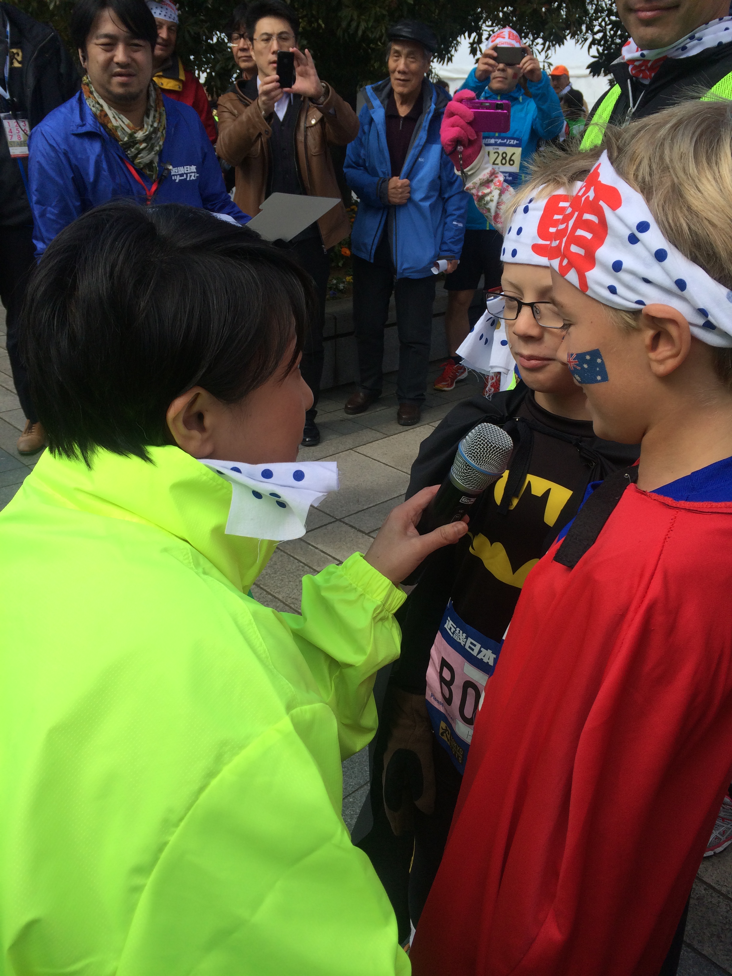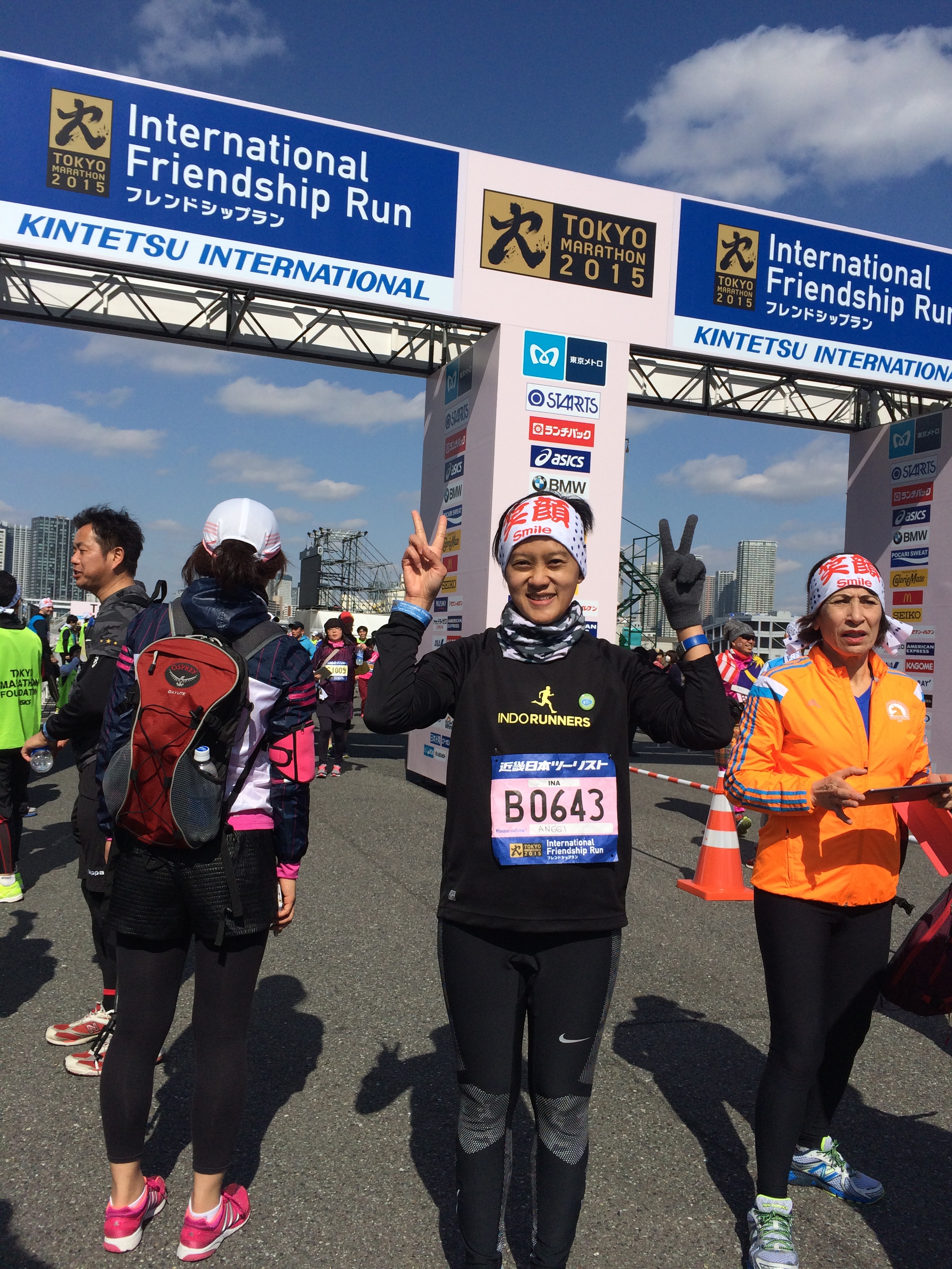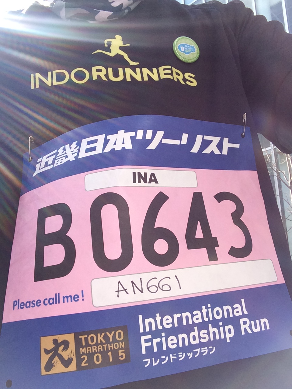 IMG_7815Tapi karena takut ga boleh bawa stroller, jadinya Adity aja yang ikutan lari. Sebelum mulai, kita diajak pemanasan bareng pake lagu gitu, lengkap dengan voice overnya. *saya download belakangan ya *nawar 🙂 Kita tinggal ngikutin gerakan instrukturnya, yang kalo ga salah denger sih cowo ini adalah PRnya Tokyo Marathon, pelari juga dan comedian Jepang, dan errr….saya lupa namanya 😀 .  Agak takjub sih liat kostumnya, karena saya sibuk nyari sarung tangan dan pengen pake jaket saking dinginnya, sementara dia cuma pake sleeveless dan short ajah tapi tampak nyaman sekali 😀