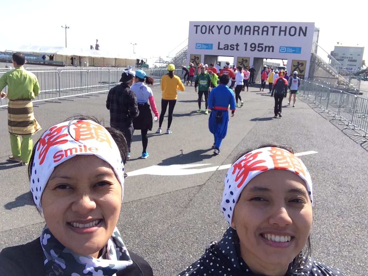 Ga lama kita udah mau nyampe ke finish line, tapi dibarisin dulu rame-rame biar rapi dan dishoot pula sama cameramen. Santey banget kan ? hehe..Kita juga sempet ngelewatin gate ‘Tokyo Marathon Last 195 m’ . Seneng banget ngeliat gatenyaaa…berasa siap banget ngadepin besok hehe..