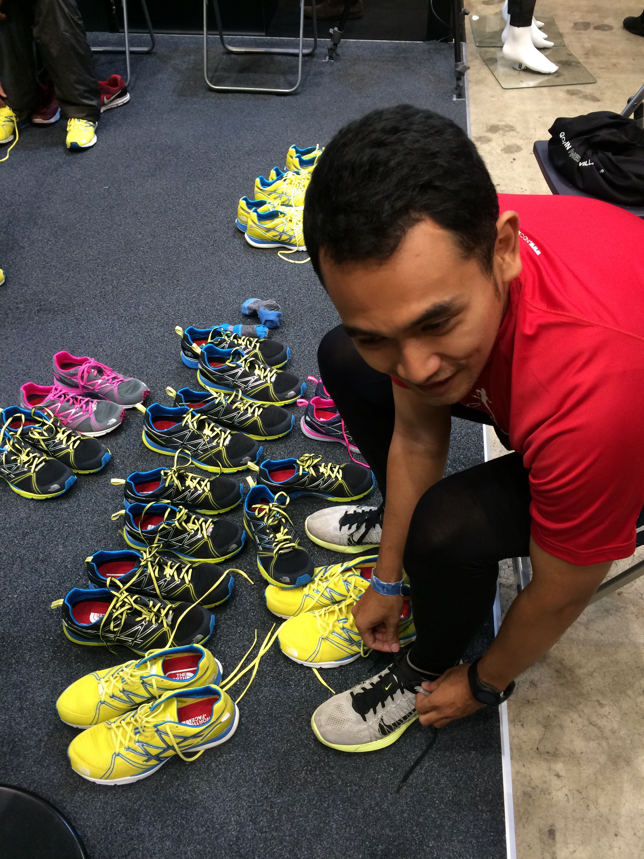 Saya trus disuruh dateng ke storenya  karena ukurannya lebih lengkap di store. Ok deh, kebetulan hari Senin nanti itinerarynya emang ke storenya Asics di Ginza. Cociks!  Bechi juga semangat banget milih-milih sepatu, dan gear lainnya. Pokoknya shop til u drop ya Chi 😀 Saya ga tau berapa banyak sepatu yang Bechi beli, kaos yang Bechi borong, kaos kaki, compression, tights yang Adity beli, ga tau juga berapa banyak kartu yang mereka gesek di expo ini hahaha…tapi liat dari tas belanjaannya sih banyaaaaak banget! 😀