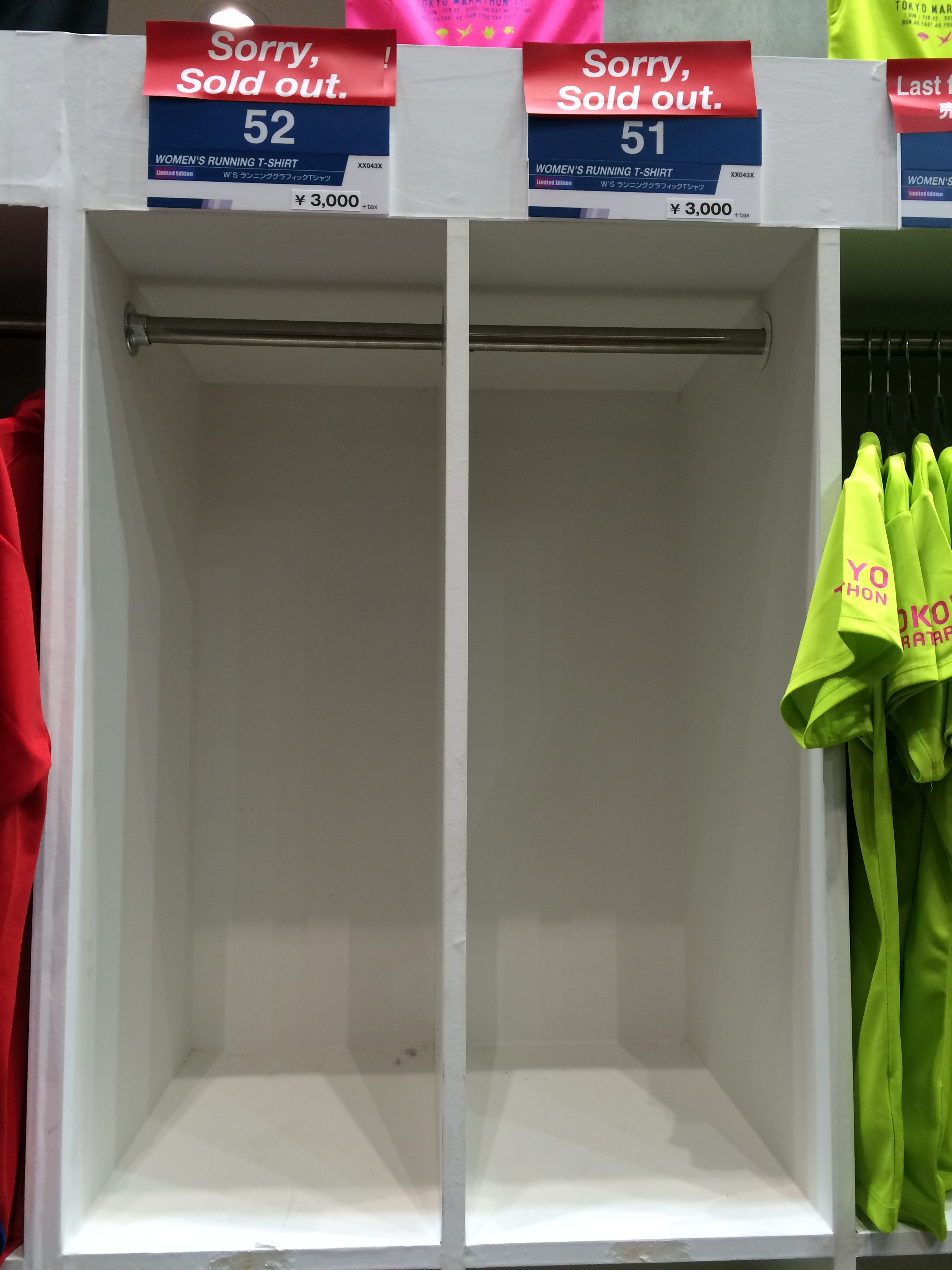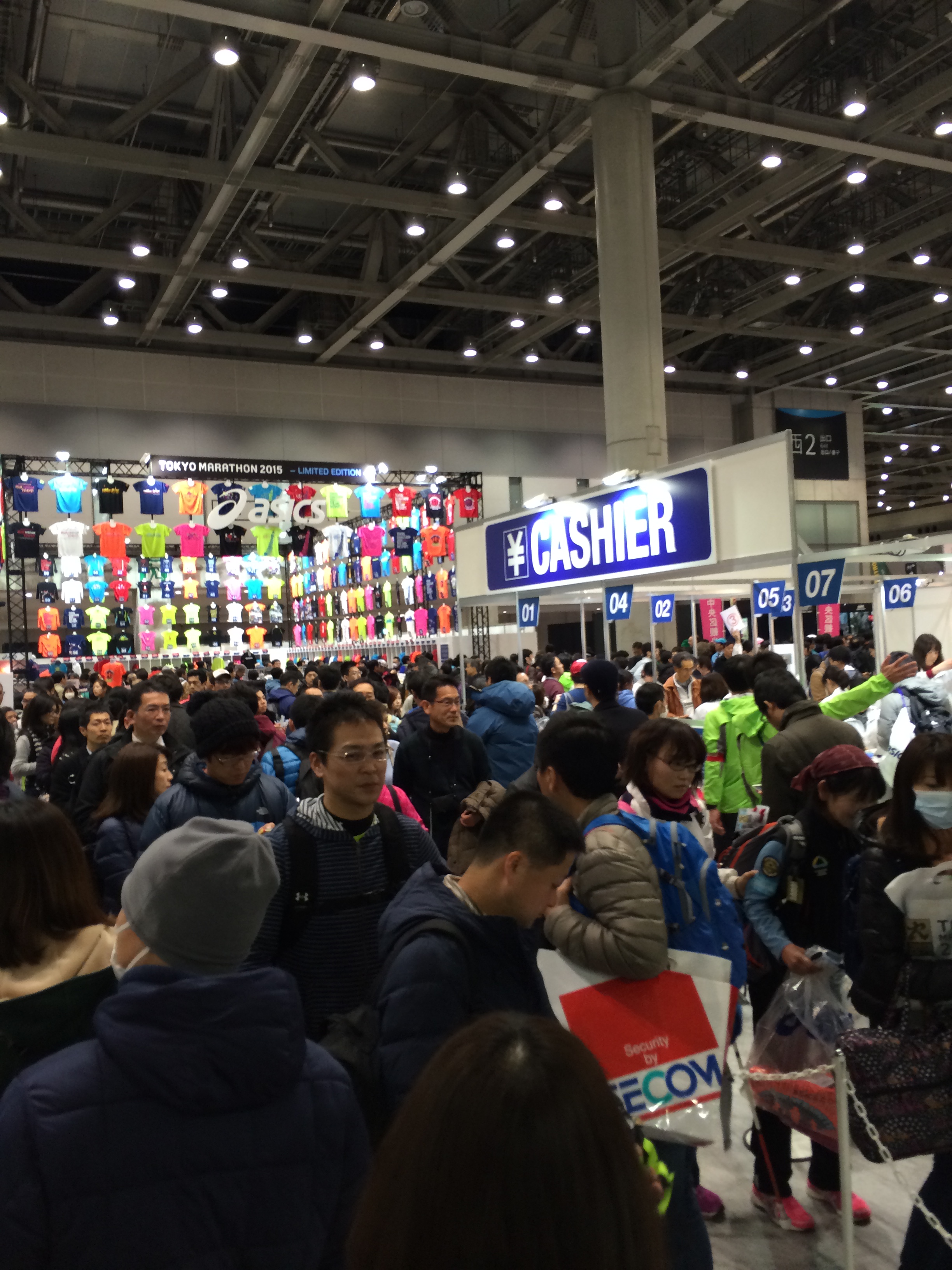 IMG_7965 Begitu mampir ke boothnya Asics, gileee raknya udah pada kosong aja sodara-sodara!   Jadi designnya udah ga bisa milih, dan size pun tinggal yang ada aja. Belakangan saya baru tau dari twitter officialnya TokMar, kalo pengunjung Tokyo Marathon Expo 2015 kali ini mencapai 103.330 orang dan memecahkan rekor pengunjung tahun kemarin. Woow cool!