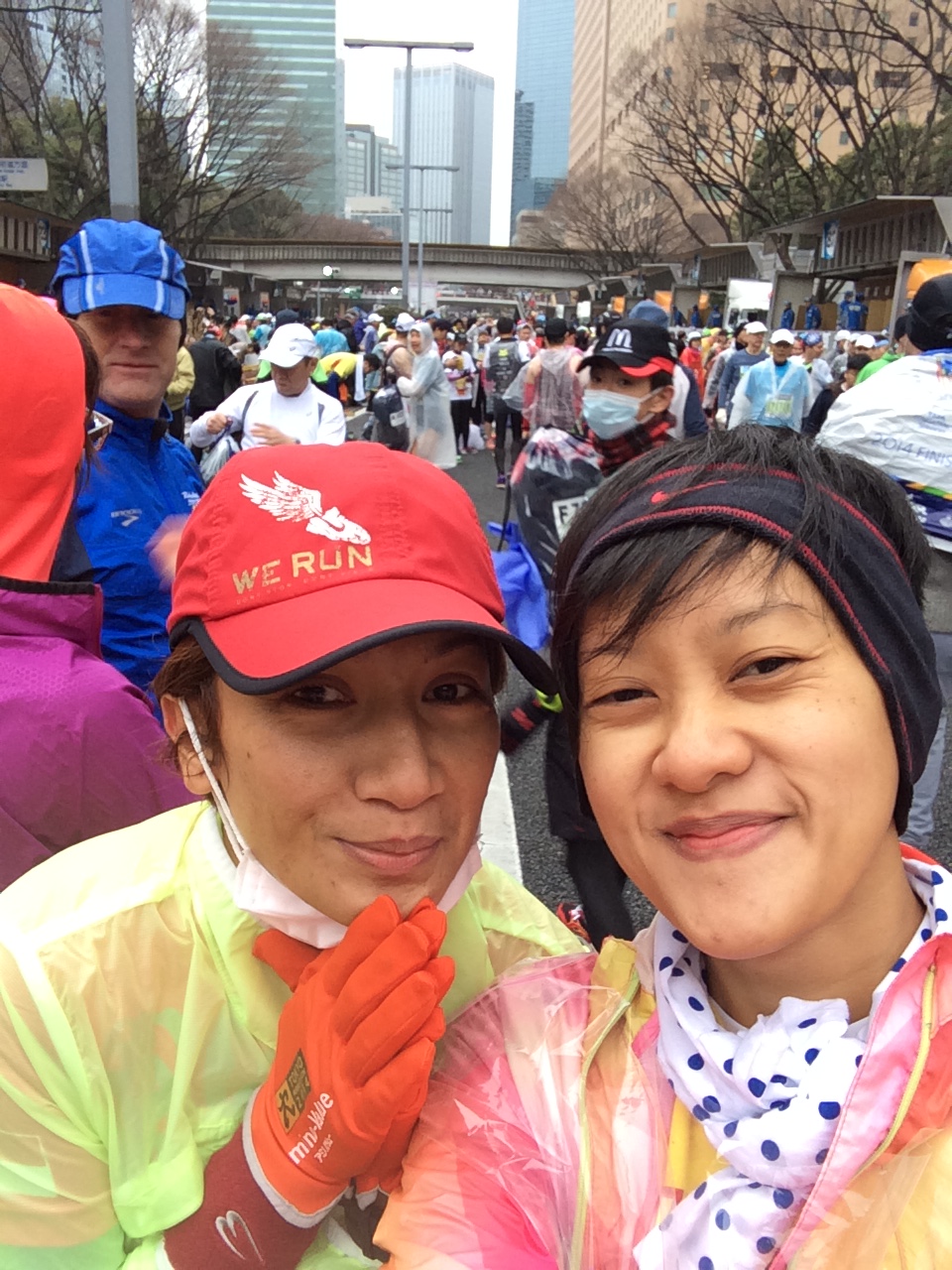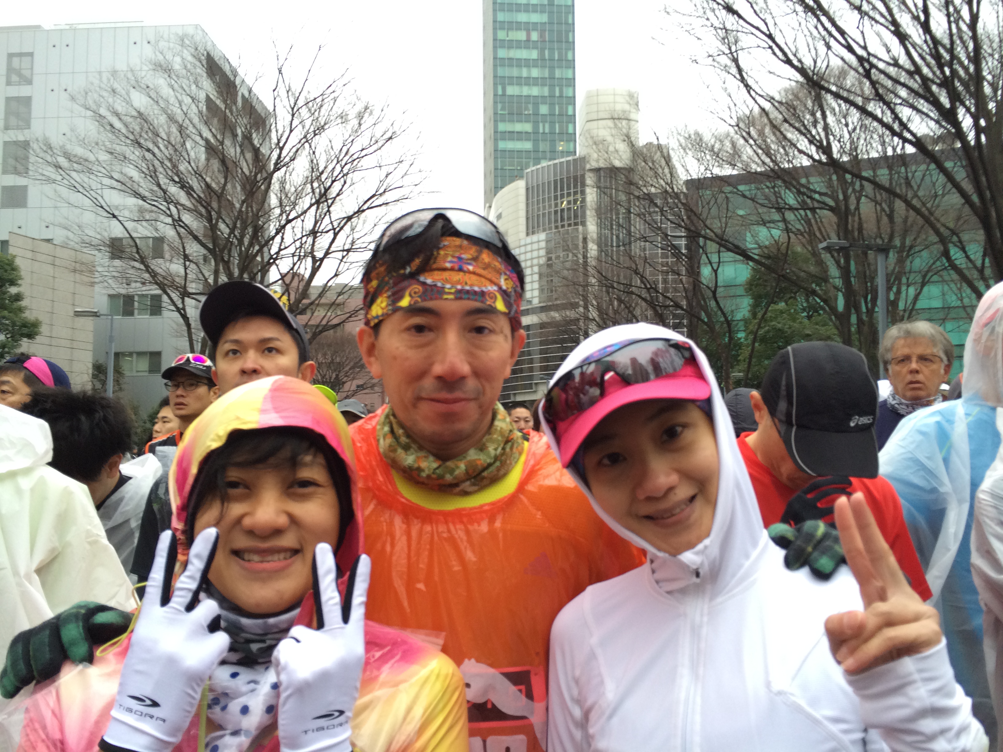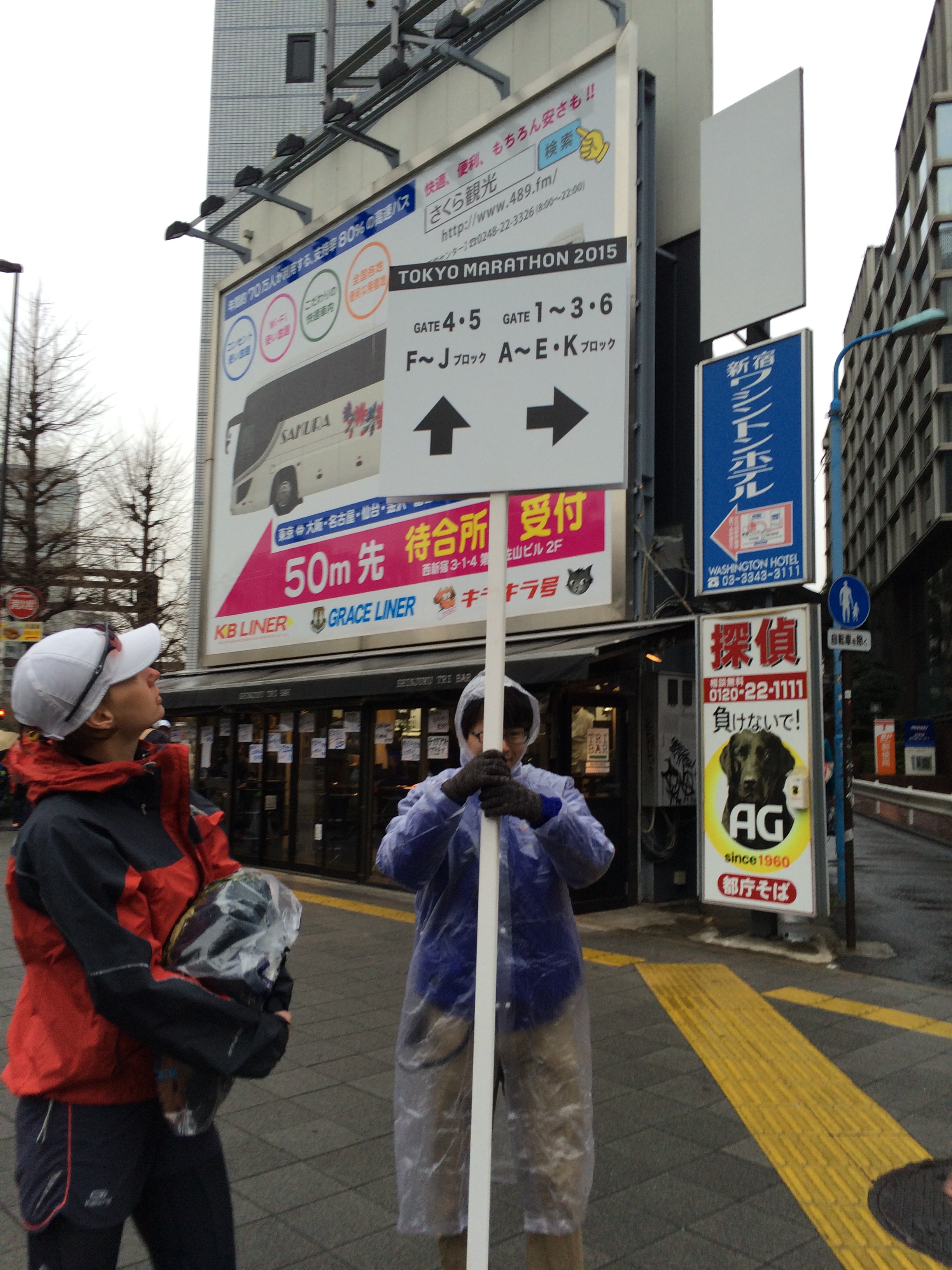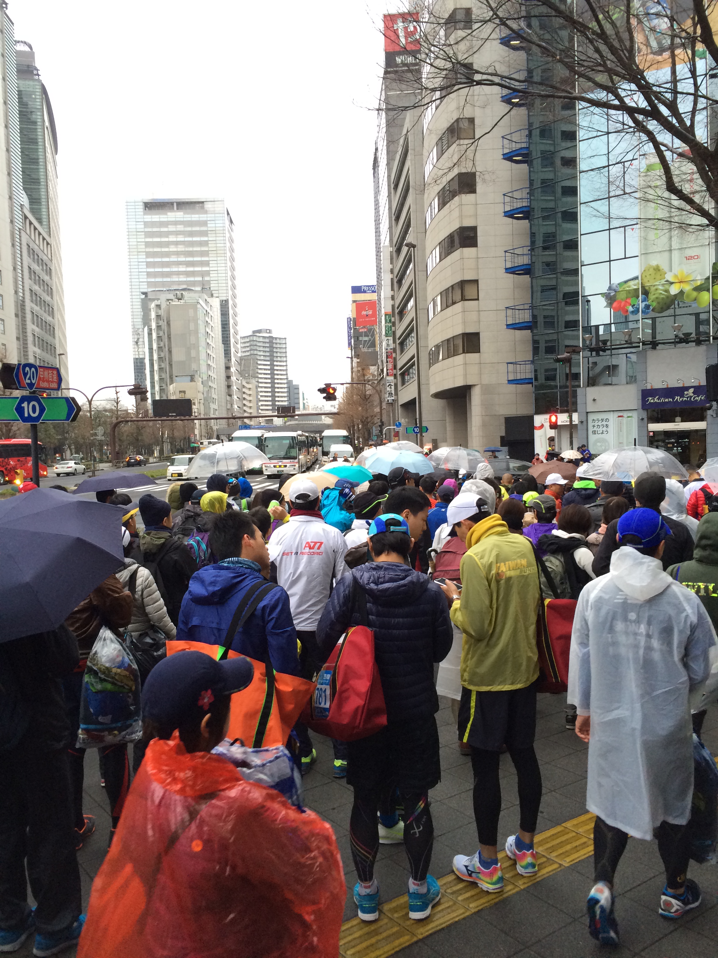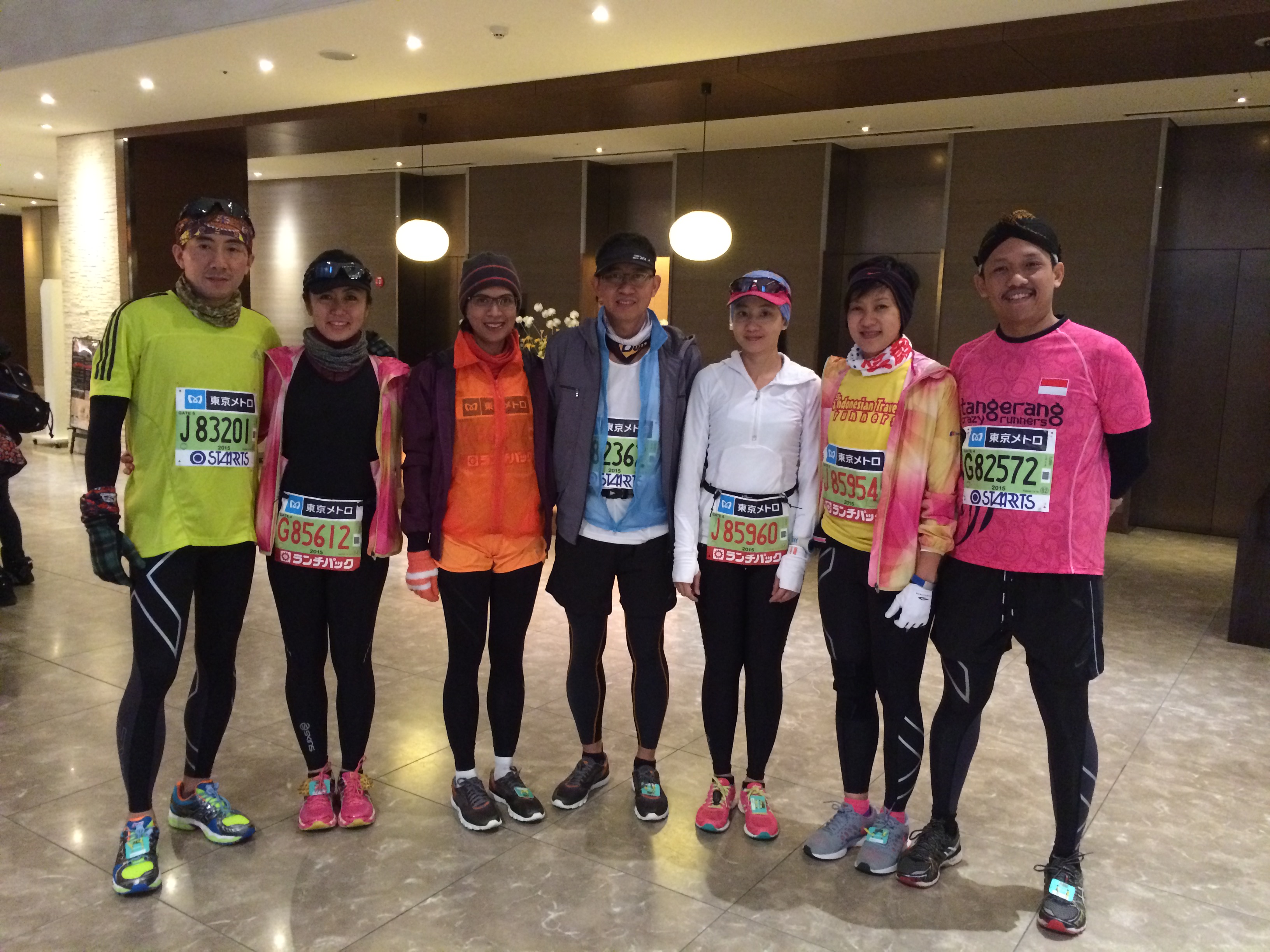 Abis gitu saya mulai siap-siap dan langsung cus keluar hotel.  Ga lupa bawa peralatan perang paling penting: pocket wi-fi beserta batere dan kabelnya, sama power bank plus kabel dan  dimasukkin semua dengan rapi ke Spibelt dari Adham :D. Pas keluar hotel ternyata gerimis dan langitnya gelap banget. Menurut prakiraan cuaca, Tokyo emang bakalan hujan seharian katanya. Oh tidaaak! Baru juga selangkah keluar hotel menuju train station yang jaraknya 100 m, saya udah menggigil kedinginan…brrrr…di train station, udah banyak pelari yang wara-wiri juga. Cuma 5 menit, saya udah sampe di Shinjuku Station. Pas ngintip ke jalan, ternyata gerimisnya masih tetap bertahan huhu…gimana ini?  Akhirnya saya memutuskan untuk naik taksi dari stasiun, ke hotel Sunroute Plaza daripada kehujanan hehe.. Begitu nyampe lobby, Mas Annif udah siap plus ga lupa pake blangkon hehe..Ga lama semuanya udah pada turun dan jam 7 pagi, kita semua pun berangkat bareng. Let’s go!