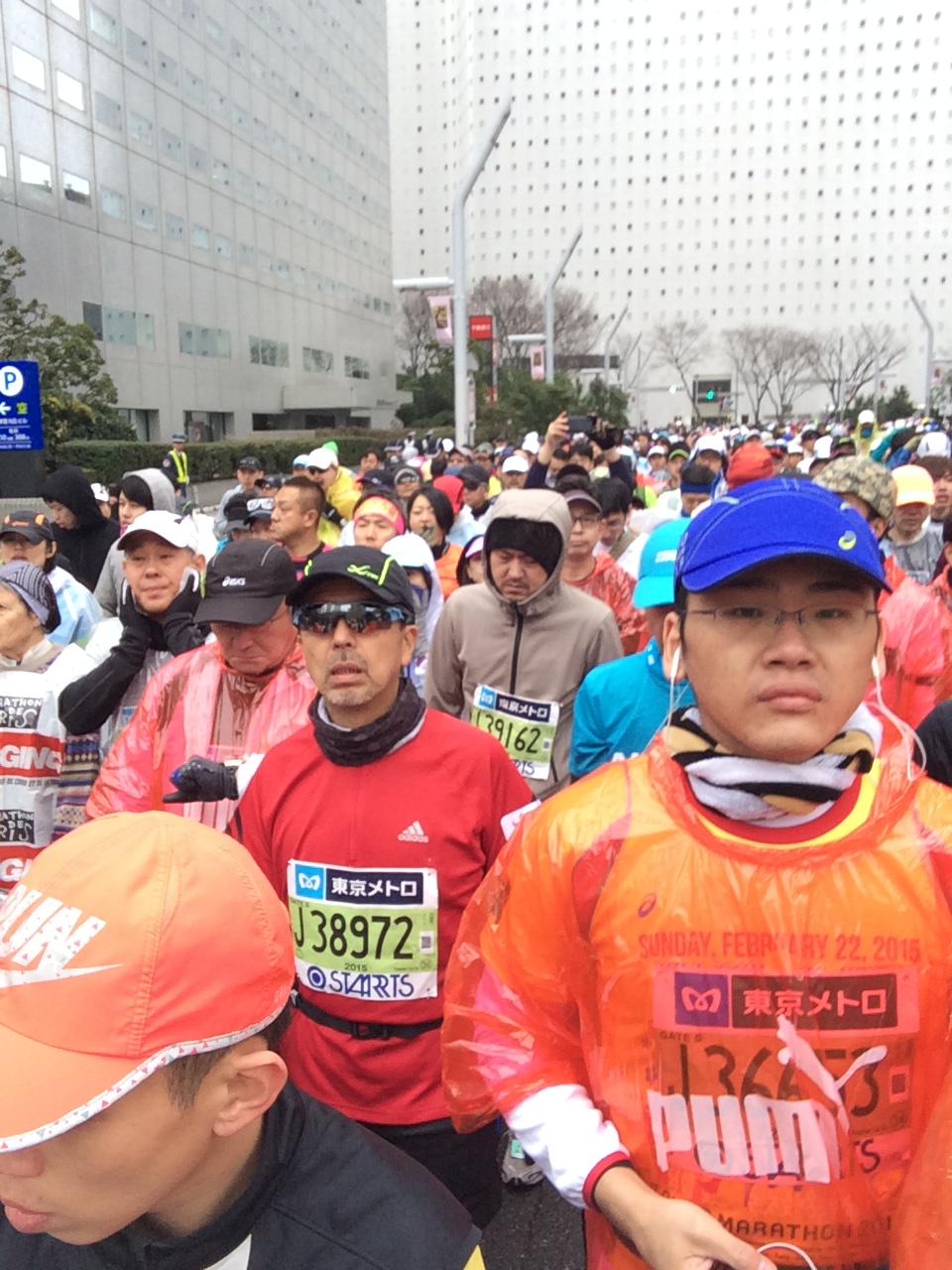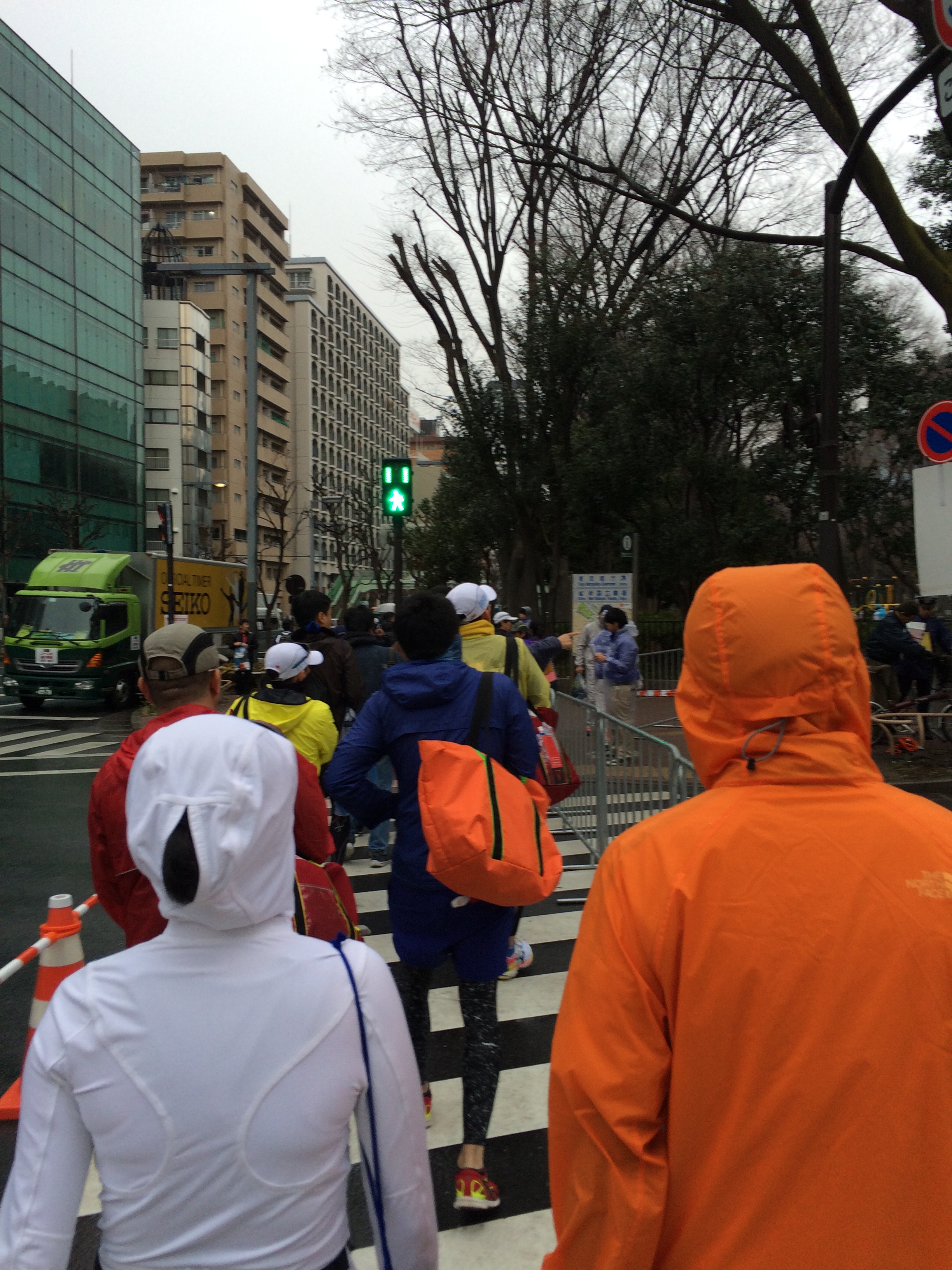 Ternyata di setiap sudut jalan udah ada crew yang bawa sign Tokyo Marathon, buat memastikan ga ada yang bingung ke tempat startnya masing-masing. Kebetulan saya, Yustin dan Om Freddy kebagian start di blok J, jadi kita barengan terus menuju tempat start.