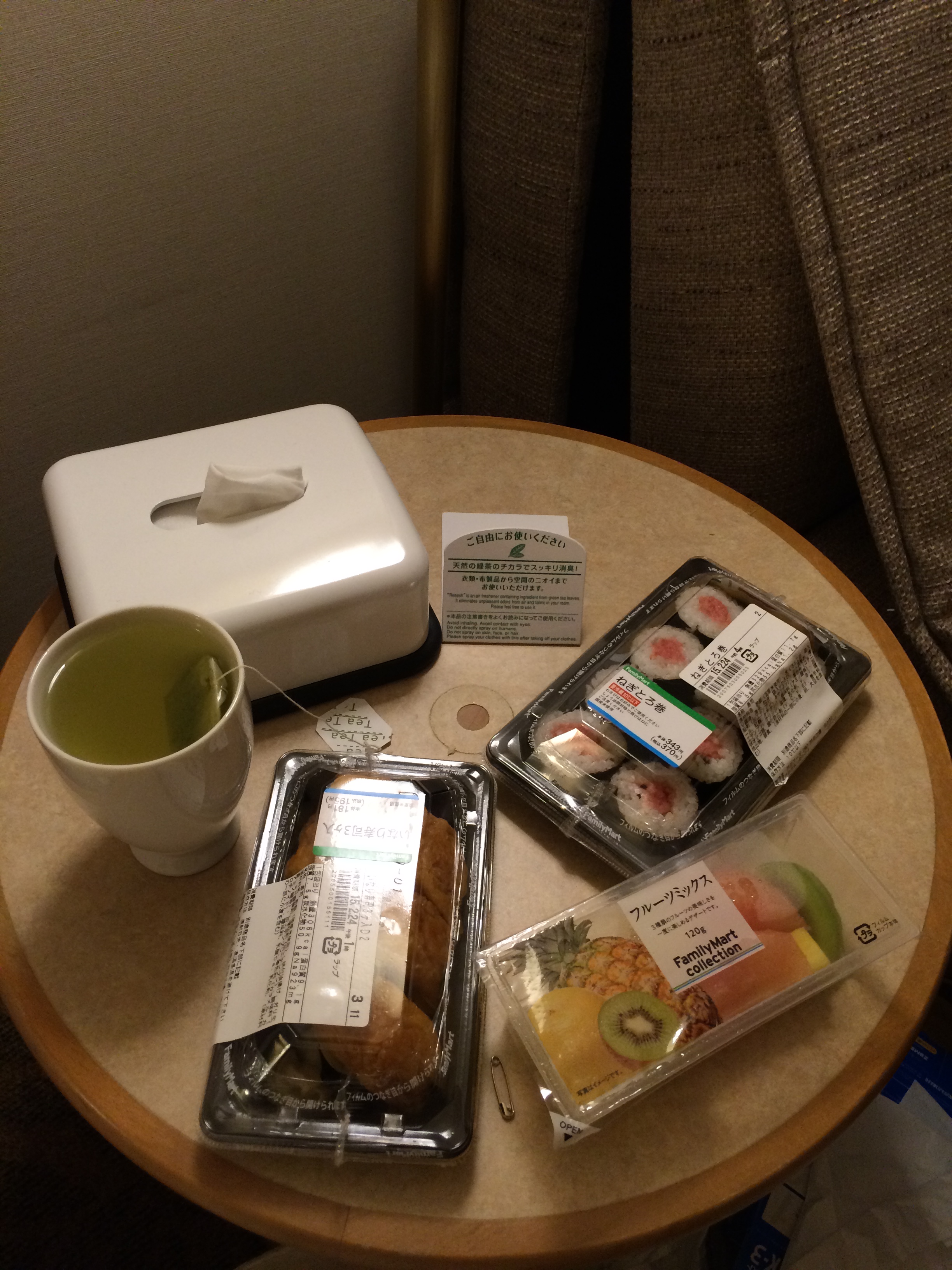 Sebelum nyampe hotel, mengingat kaki ini pegel banget dan ga pengen keluar hotel lagi, saya memutuskan untuk beli makanan di Family Mart aja biar cepet dan praktis. Beres berendem air panas, trus saya dinner sendirian pake hot ocha yang disedian hotel. Ga kalah juara kok rasanya sama makan di restoran 😀