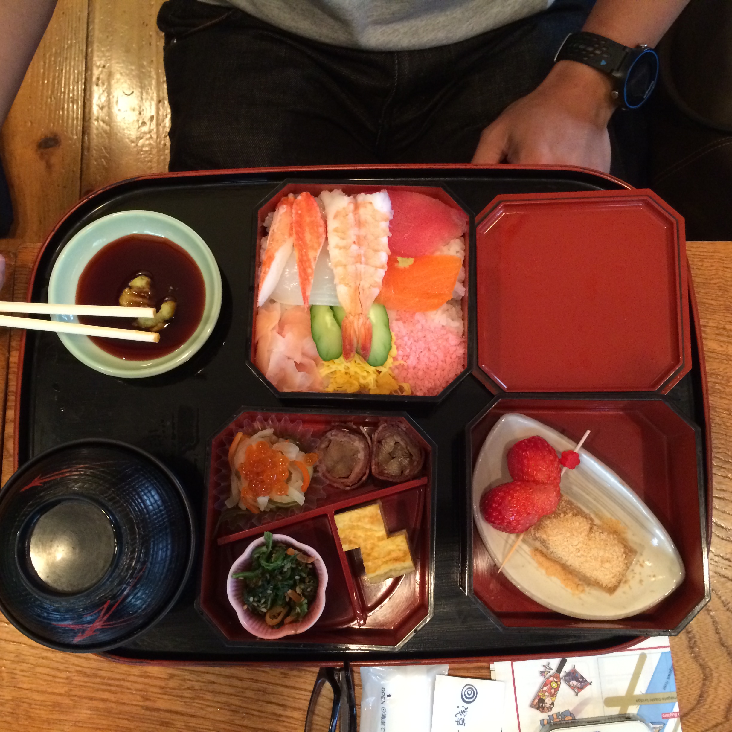 Begitu ngeliat jam ternyata udah hampir jam 12 dan saya menuju ke meeting point tadi. Setelah kumpul semua trus kita putuskan untuk cari makan siang di daerah sini juga. Setelah muter-muter, pilihannya jatuh di tempat ini, dan karena dibawahnya penuh, kita pun dipersilakan untuk naik keatas. Hadeuuuh…lagi males ketemu tangga, eh malah ketemu tangga tinggi banget 😀 abis itu kita disuruh buka sepatu dan duduk lesehan ala Jepang 🙂 Beres ngorder dan ga lama makanan pun datang…Itadakimasu…. 🙂
