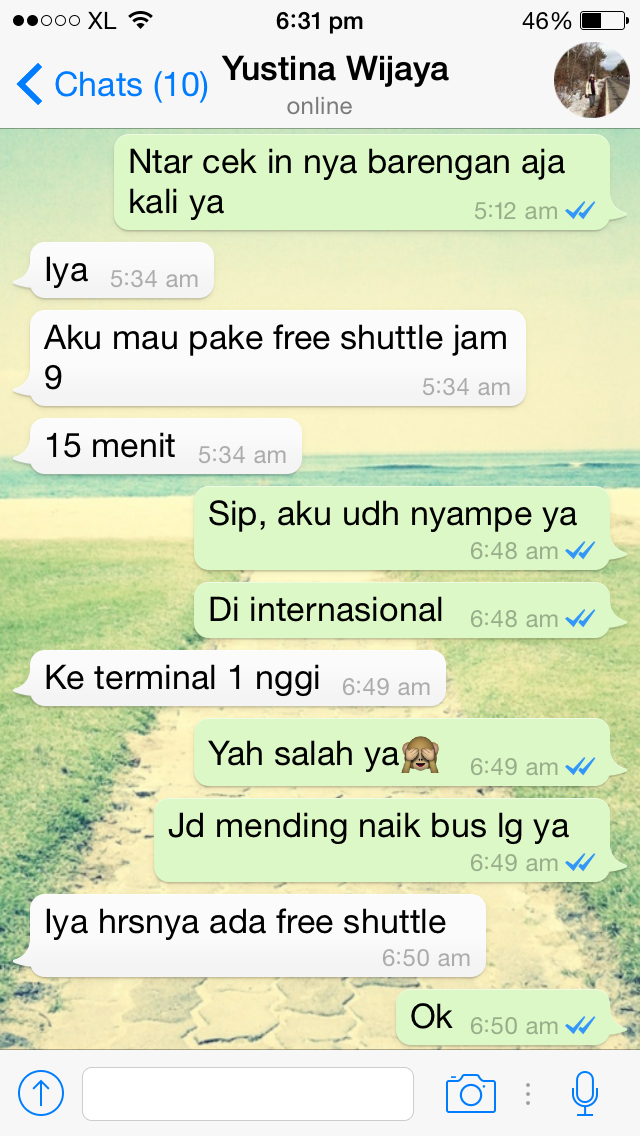 Perjalanan lancar dan jam 6.45 saya udah sampe di terminal internasional. Nyari wifi gratisan dulu dan ngabarin Yustin kalo saya udah nyampe. Iya, kita flightnya barengan lagi jam 11.45 🙂