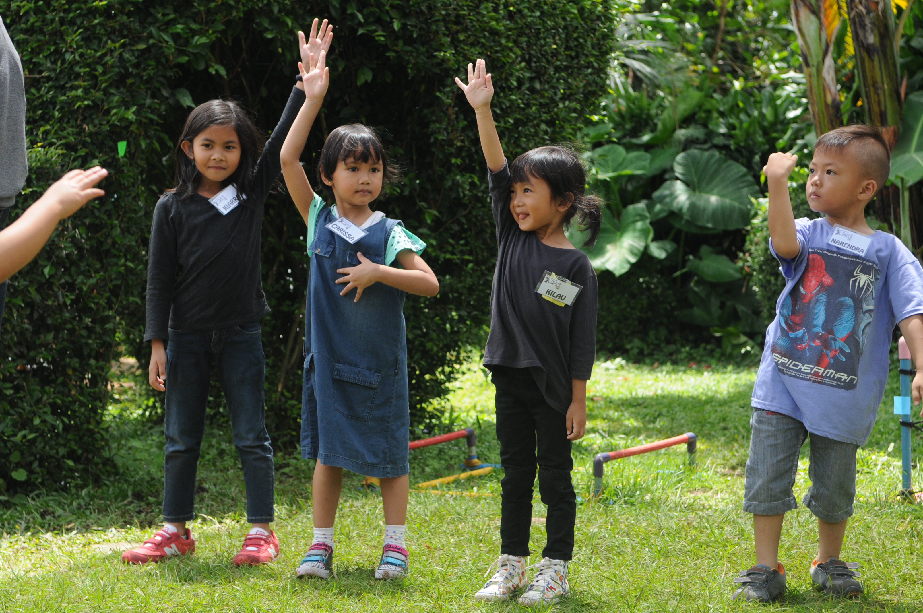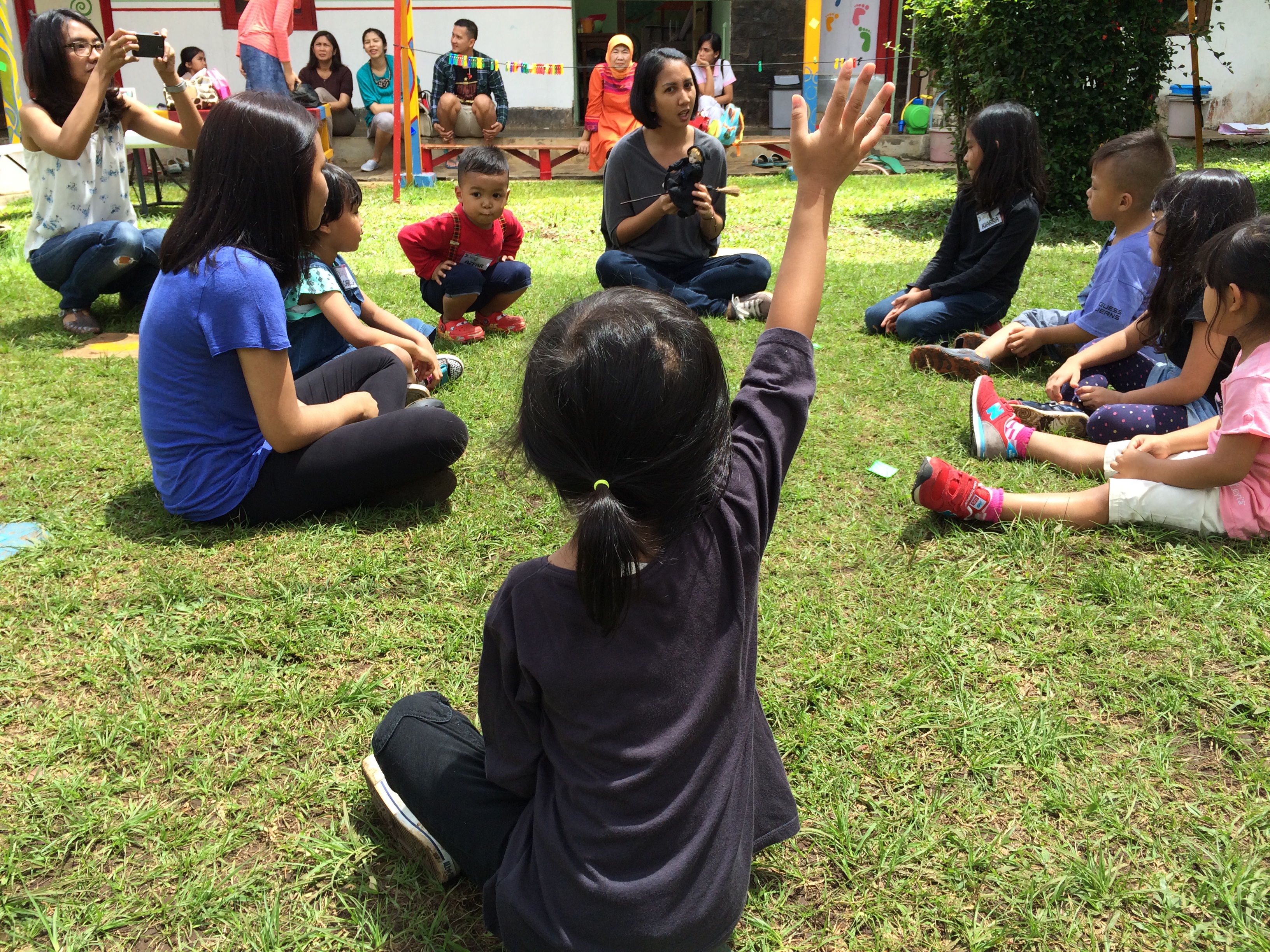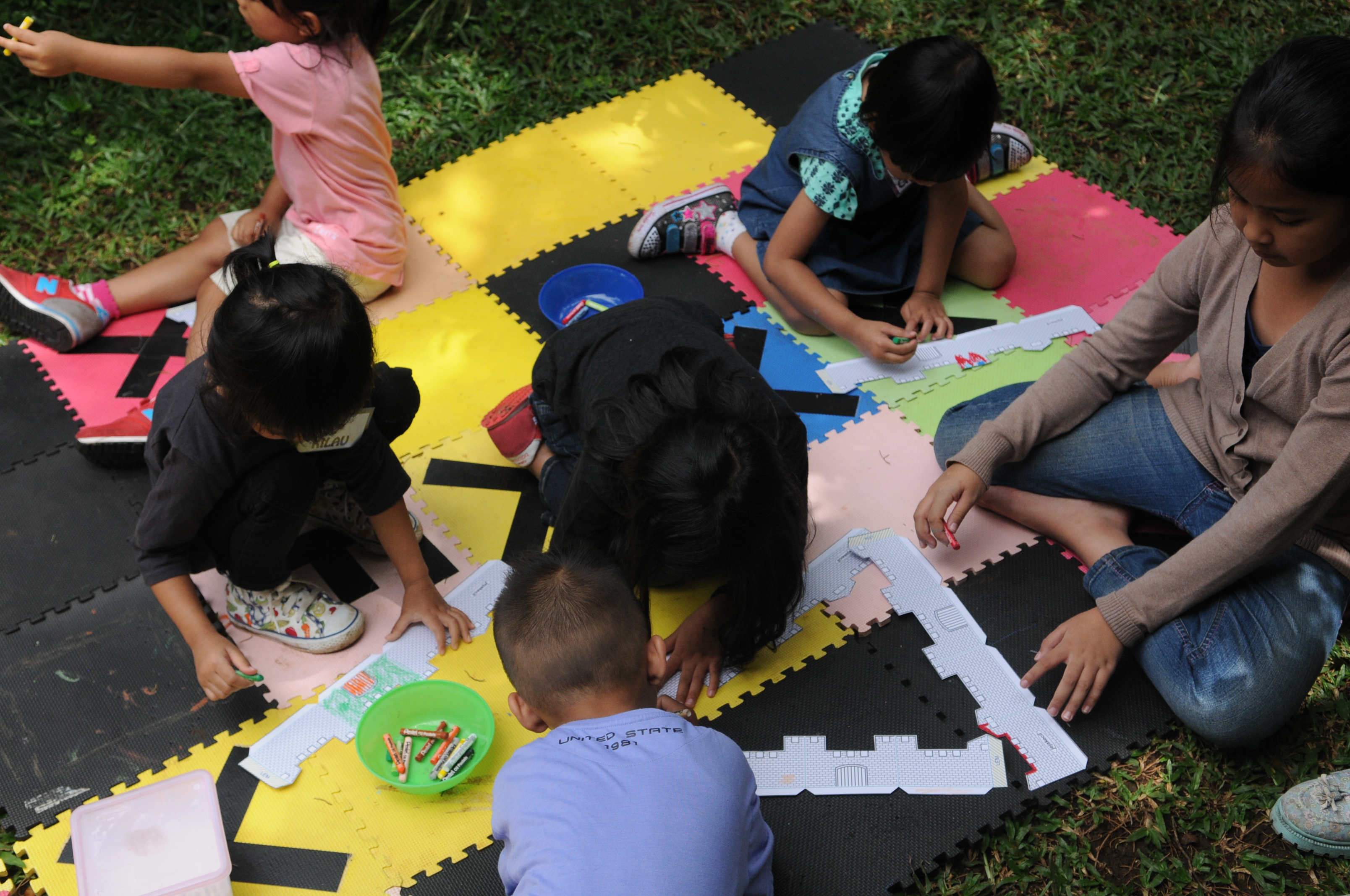 Acara pun dibuka dengan doa bersama, perkenalan, menyanyi bersama dan mulai pemanasan dengan bermain mencocokkan warna. Aktivitas ini terbukti bisa mencairkan suasana. Kilau sudah mulai bersuara, mengacungkan tangan terus-terusan dan semangat sekali menempelkan kertas berwarna yang diberikan untuk ditempelkan ke benda-benda yang sama warnanya. Setelah itu anak-anak disuruh duduk membentuk lingkaran sambil mendengarkan sang kakak bercerita seputar misi hari ini. Tim Jejak Kecil yang memanggil dirinya,”Kakak” ini berjumlah 6 orang dan mereka semua ramah sekaligus bersemangat menghadapi anak-anak yang rata-rata berusia 2-6 tahun.