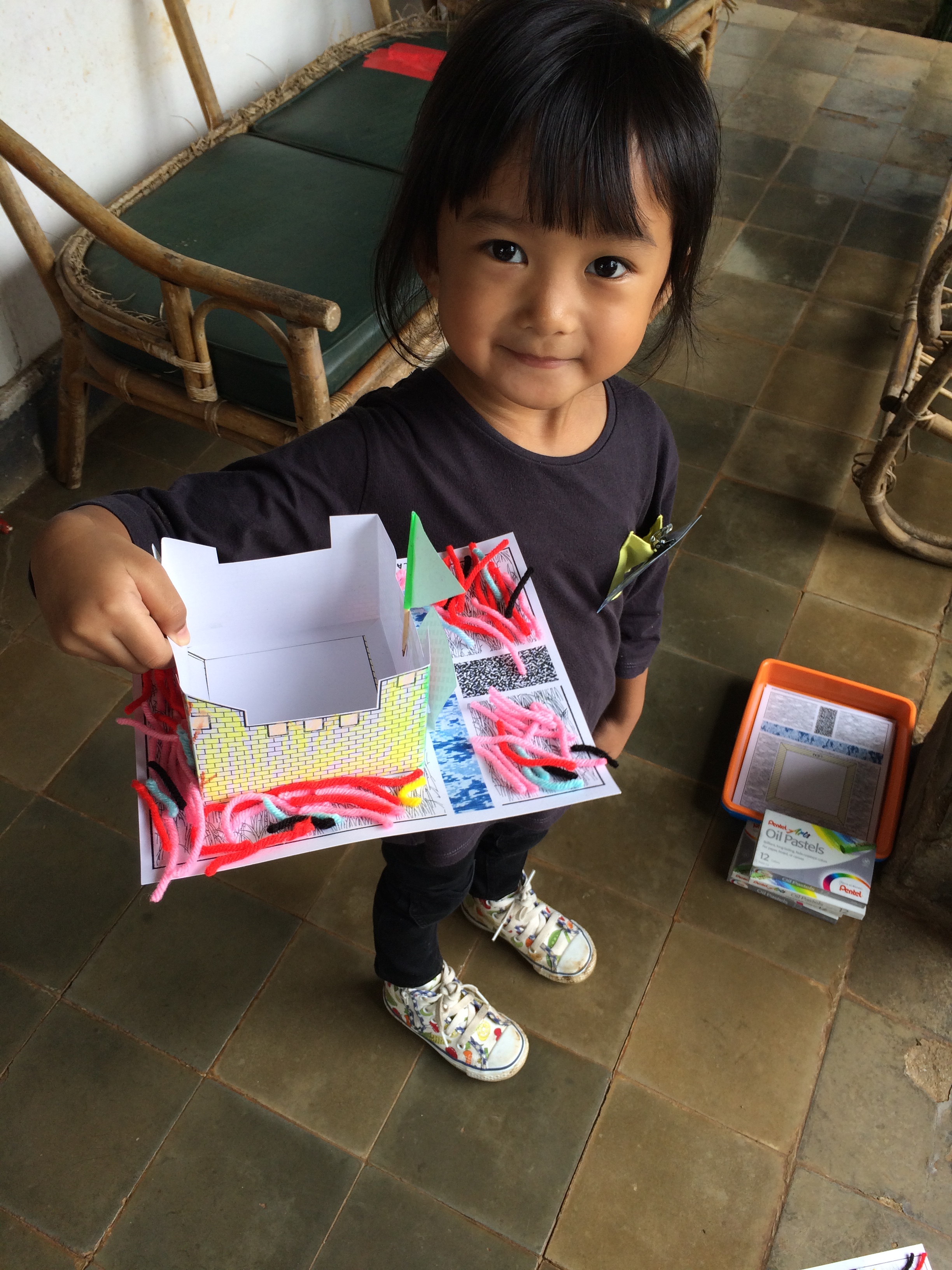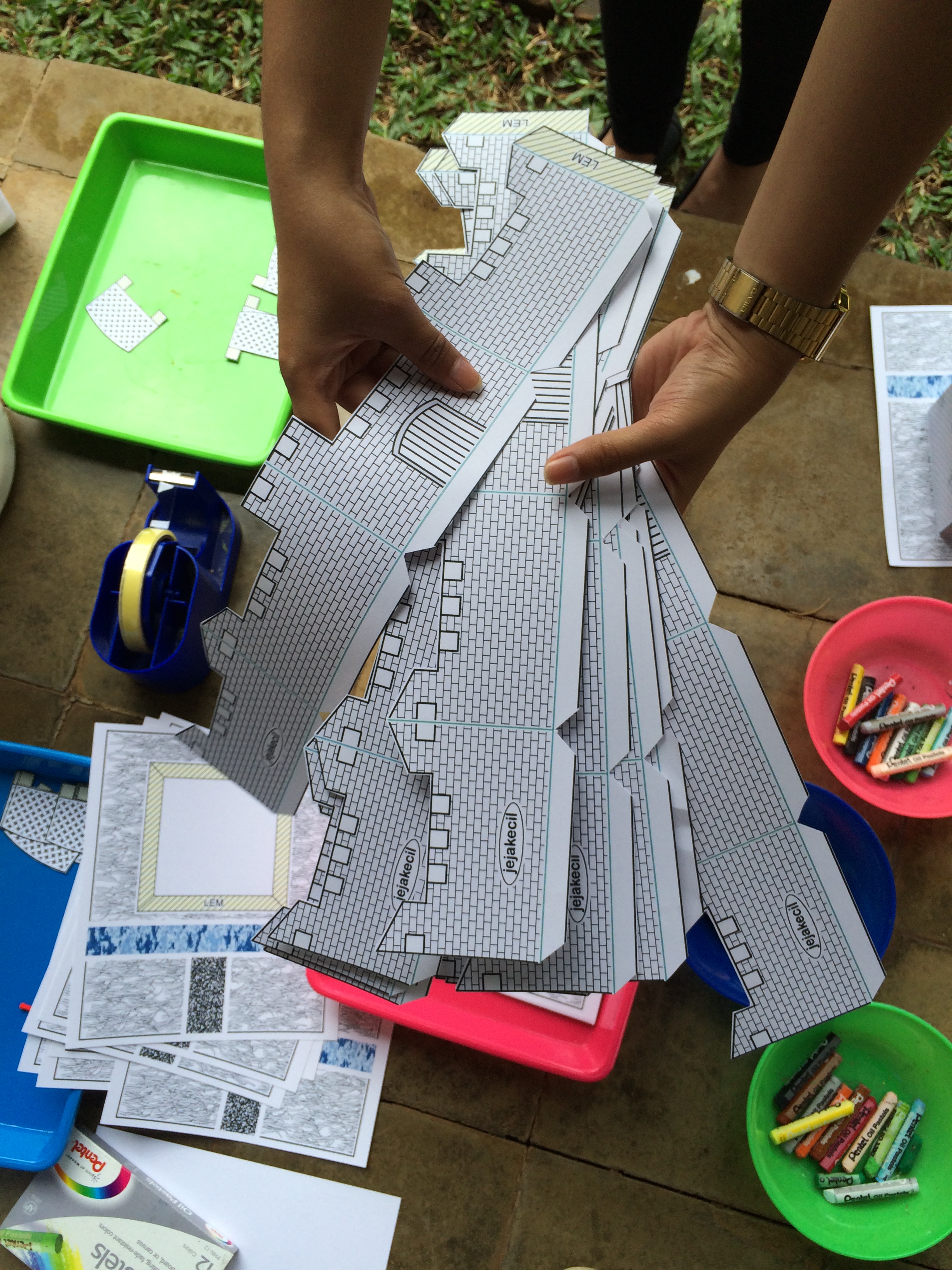 Setelah semuanya puas bereksperimen , aktivitas pun beralih untuk membuat istana sendiri. Anak-anak diminta untuk mewarnai castle terlebih dahulu, kemudian dilipat, dilem, dibentuk dan terakhir dihias sesuka hati, boleh menggunakan benang wol atau dedaunan. Sedangkan untuk finishing touchnya, mereka harus mengambil bendera yang disembunyikan, untuk kemudian ditempelkan di castlenya menggunakan selotip.