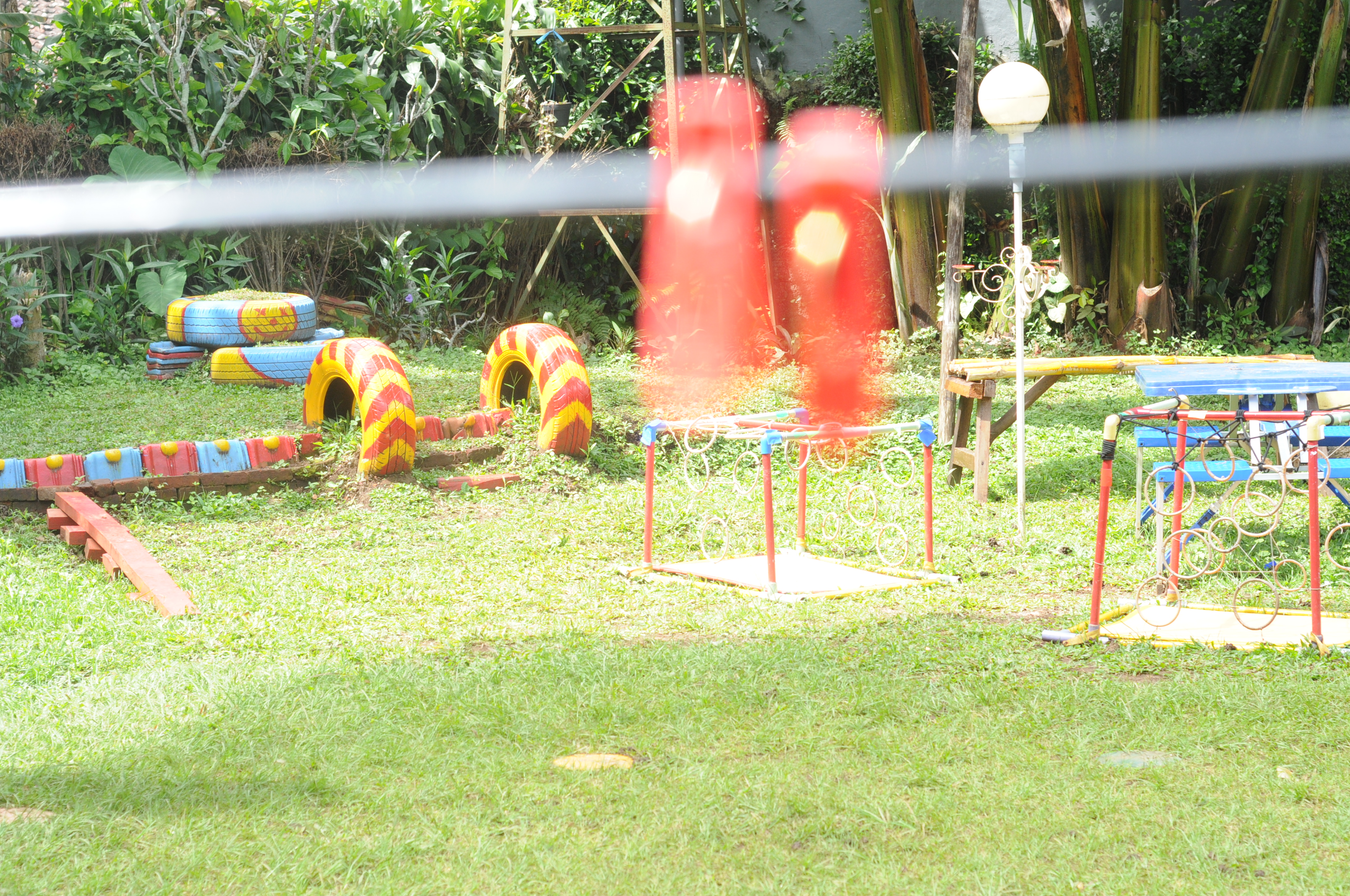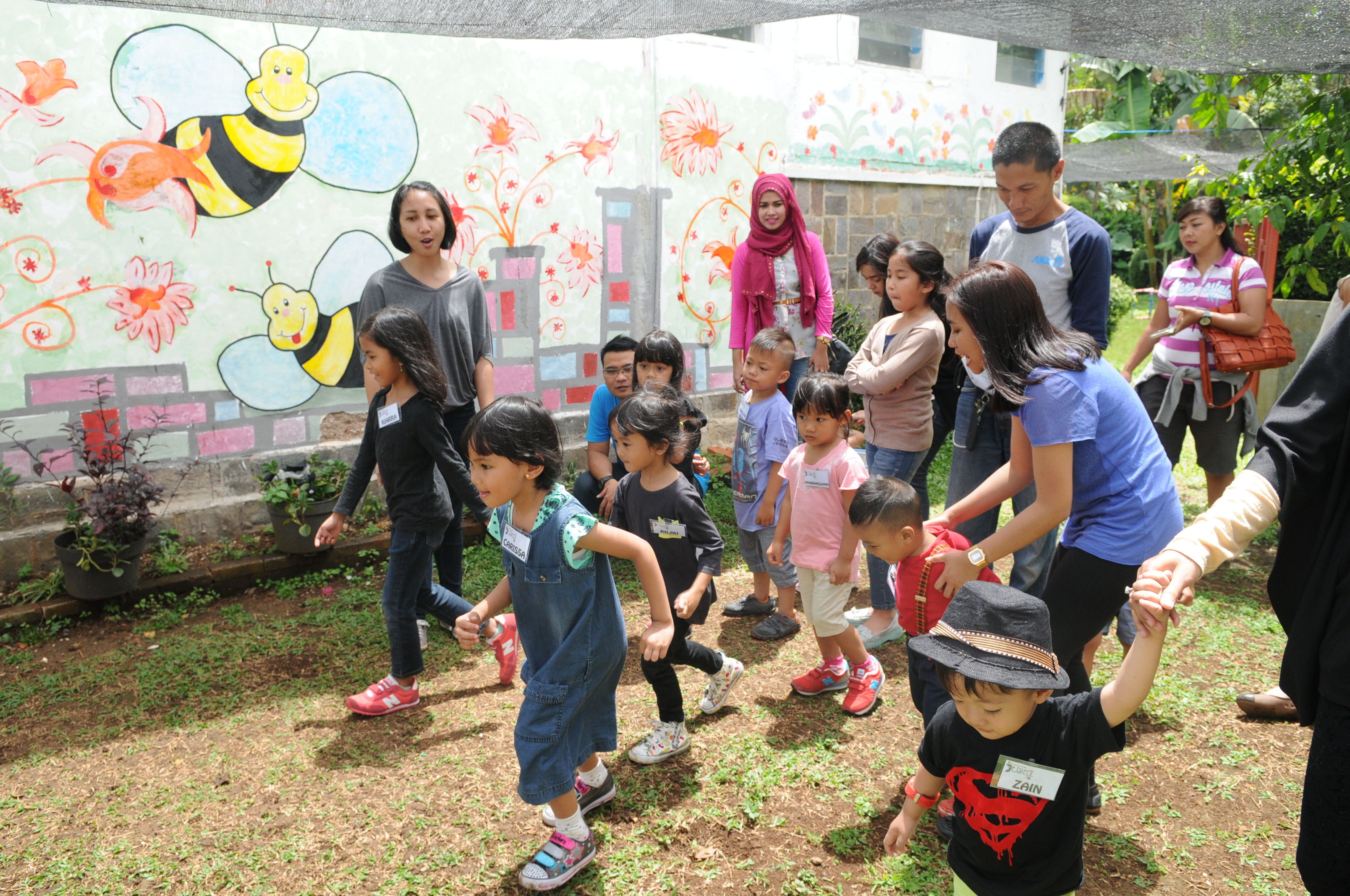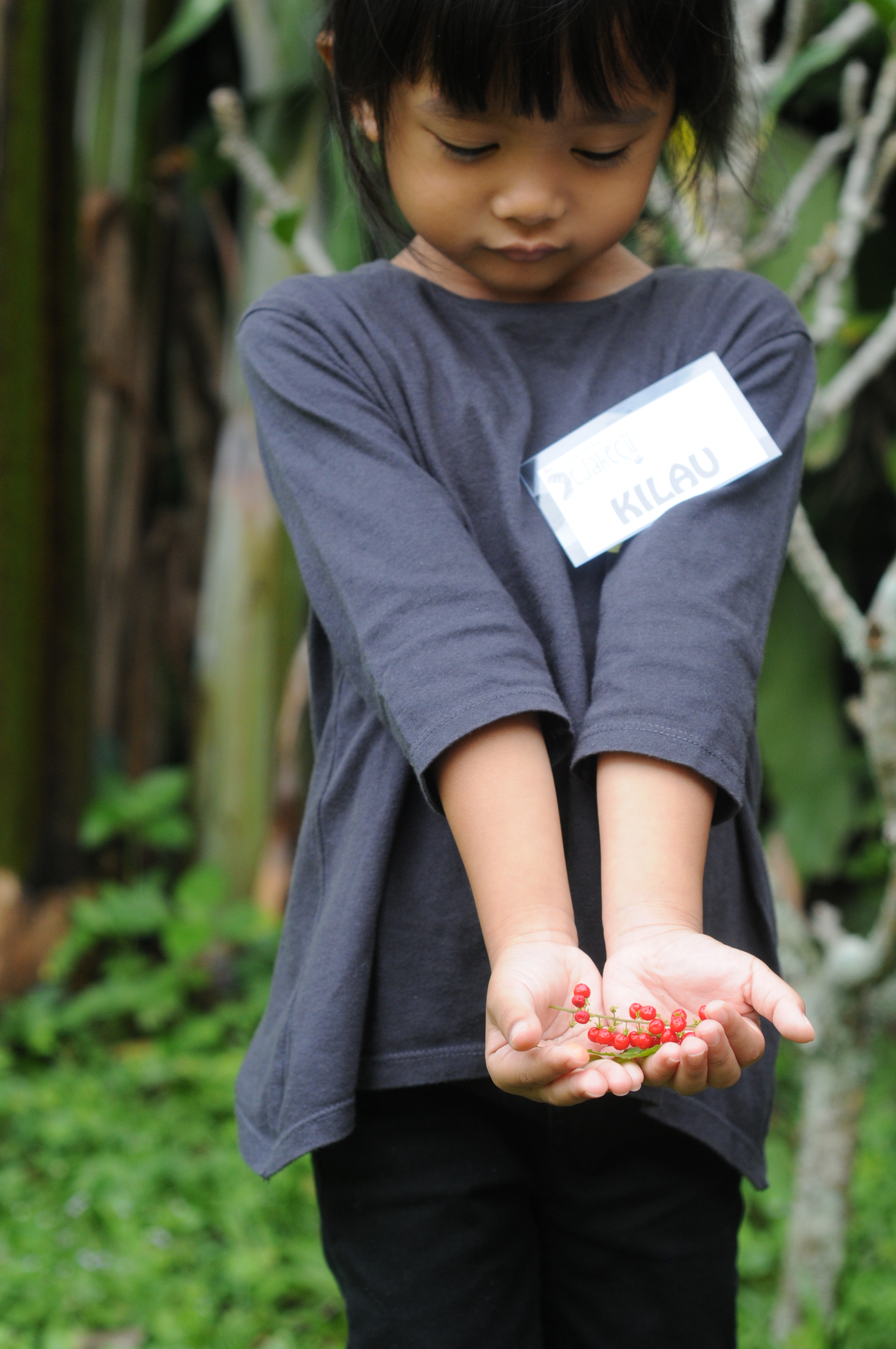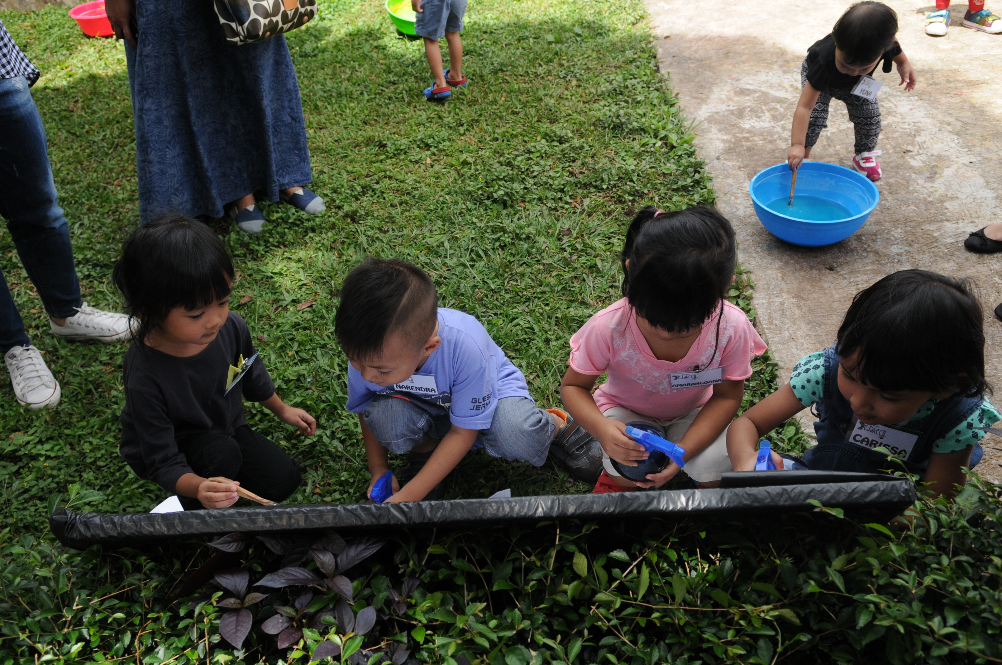 Setelah mengisi daftar hadir, mengambil name tag, dan kami dipersilakan masuk sambil menunggu para peserta lain yang belum datang. Tempatnya memang sederhana sekali. Begitu masuk ke halaman utama, kita akan melihat taman dengan beberapa kursi dan meja, lalu bak pasir yang letaknya di ujung taman. Memang tidak ada permainan outdoor seperti ayunan atau perosotan seperti pada umumnya tempat bermain anak-anak. Awalnya Kilau diam saja dan berbisik, “Ko ga ada ayunan ya, Bu?” 🙂 Tapi perhatiannya bisa dialihkan saat saya mengajaknya berkeliling melihat aneka tanaman yang ada disini.