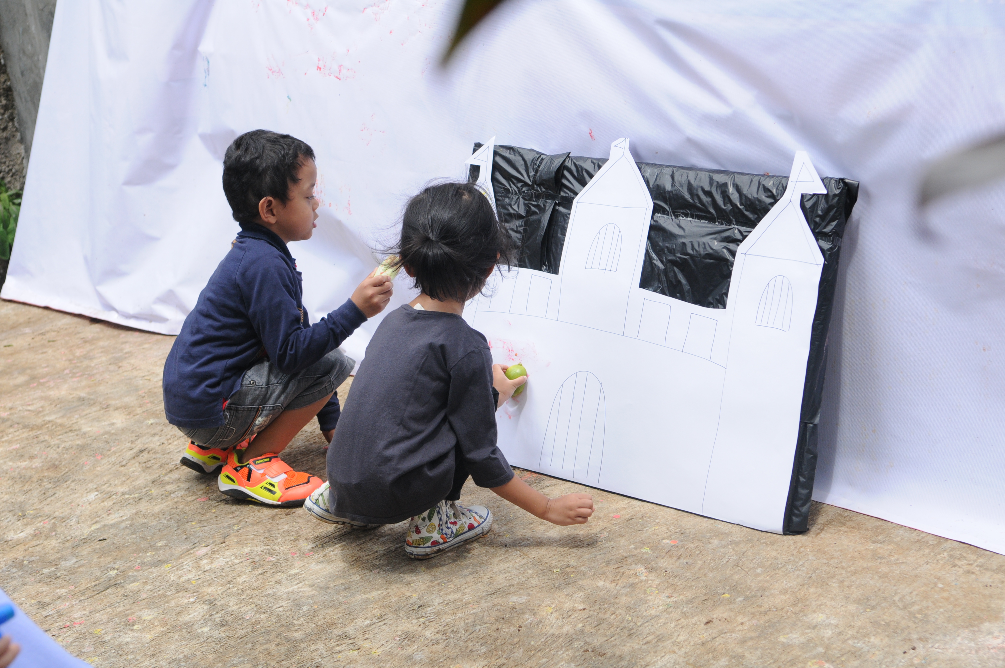Mewarnai istana adalah aktivitas pertama yang dilakukan. Semua peralatan sudah disiapkan di halaman samping. Anak-anak diminta untuk berbaris, kemudian bergantian berjalan diatas balok, memilih alat-alat yang sudah disediakan lalu kemudian bebas berkreasi untuk mewarnai istana yang terbuat dari kertas.