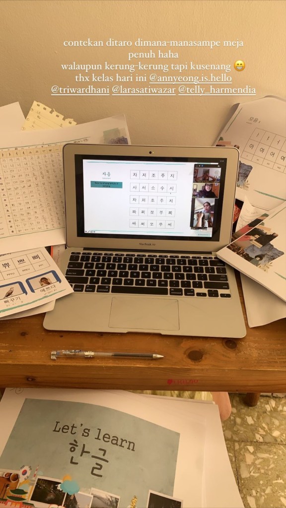 Beberapa bulan belakangan ini lagi semangat belajar bahasa Korea. Gara-garanya ya apalagi kalo bukan tenggelam dalam kegemesan film drama Korea. Seneng aja denger orang Korea di drakor ngomong dengan nada yang mirip Sunda, lemes-lemes gimana gitu. Awalnya liat postingan Sazki yang juga lagi ikut les, trus gabunglah di kelas Korea bareng Ayu yang jadi gurunya. Dari awal tuh ternyata emang udah ribet yah hahaha.. ngafalin huruf hangeul aja sampe berapa minggu. Kapasitas otak kayanya mulai mengecil, jadi susah banget ngafalinnya hahaha… Yang saya inget paling lancar sih baca ‘Anyeonghaseo’ sama ‘Bangtan sonyeongdan’ doang, selebihnya masih liat contekan…*ngakak sendiri